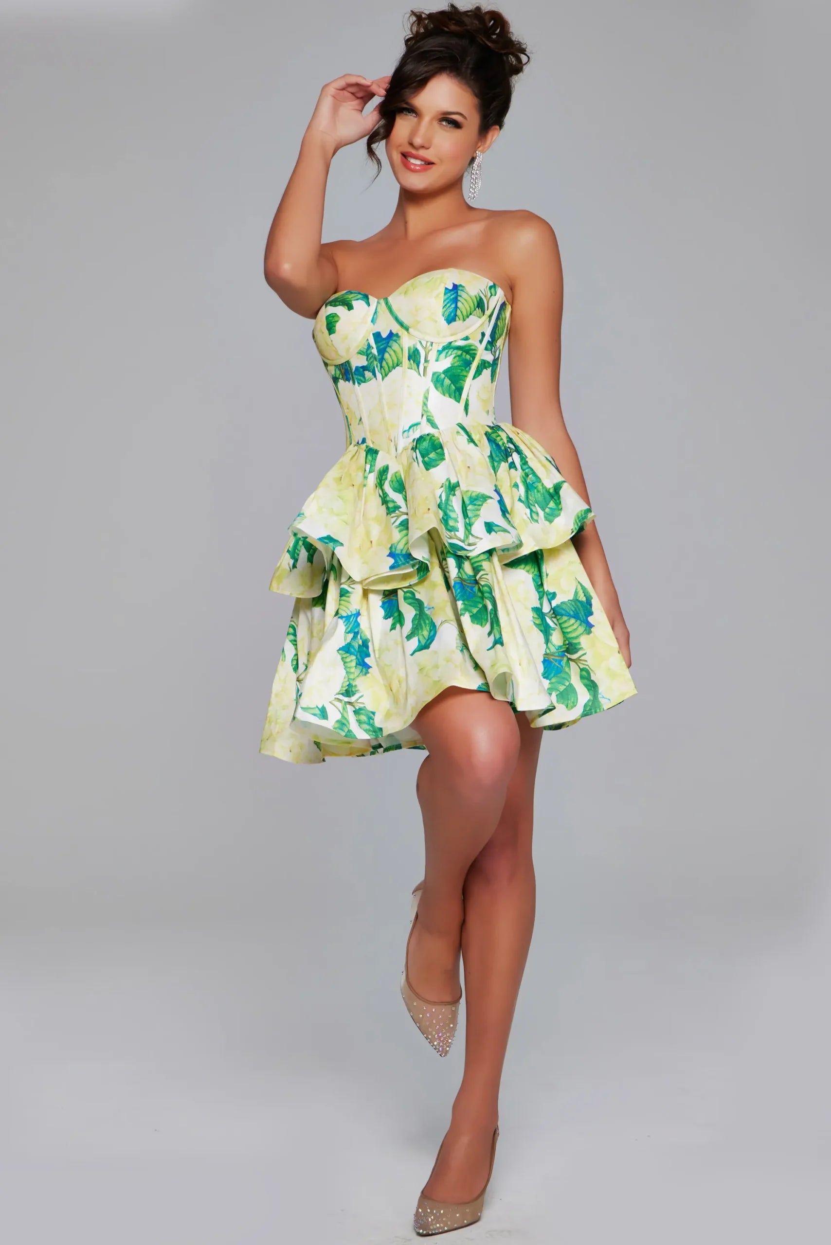 Make sure the description contains all the information provided. JVN-37057 is a Jovani prom dress, priced at $298.00. Available in a Green/Yellow Print, this dress comes in sizes 0, 00, 10, 12, 14, 16, 18, 2, 20, 22, 24, 4, 6, and 8.
