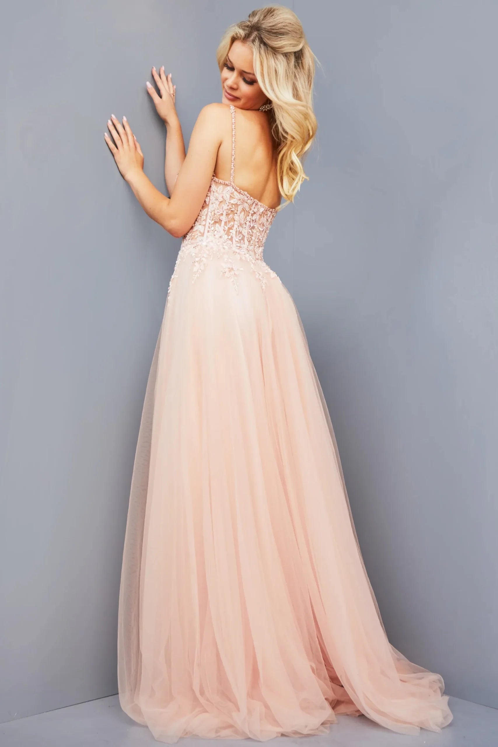The Jovani JVN-7259 prom dress is available in Blush, Light Blue, Lilac, and Navy. Sizes range from 00 to 24, ensuring a perfect fit. Priced at $1040.00, this elegant gown is a sophisticated choice for your special occasion. Currently no sale price is offered.
