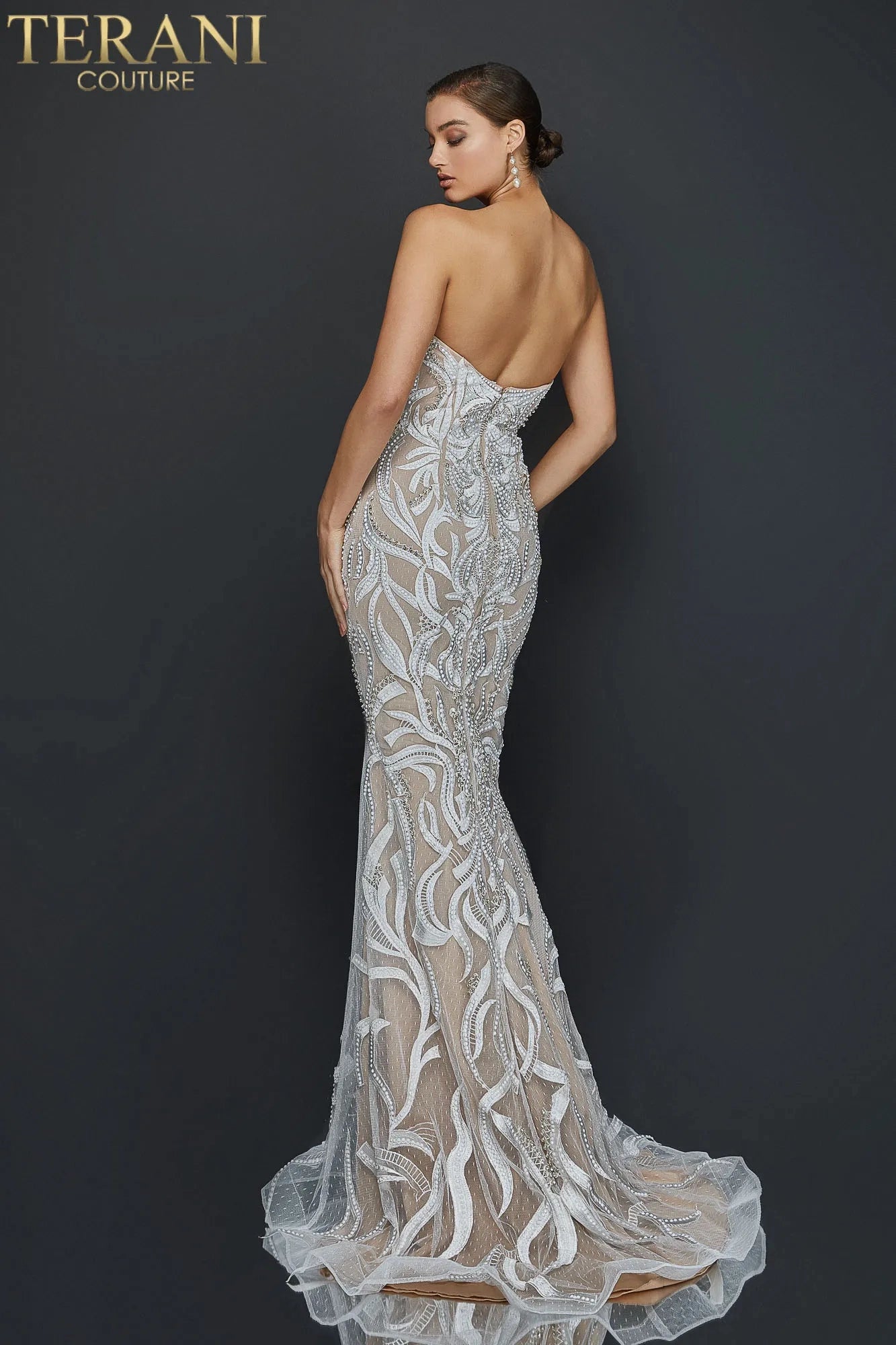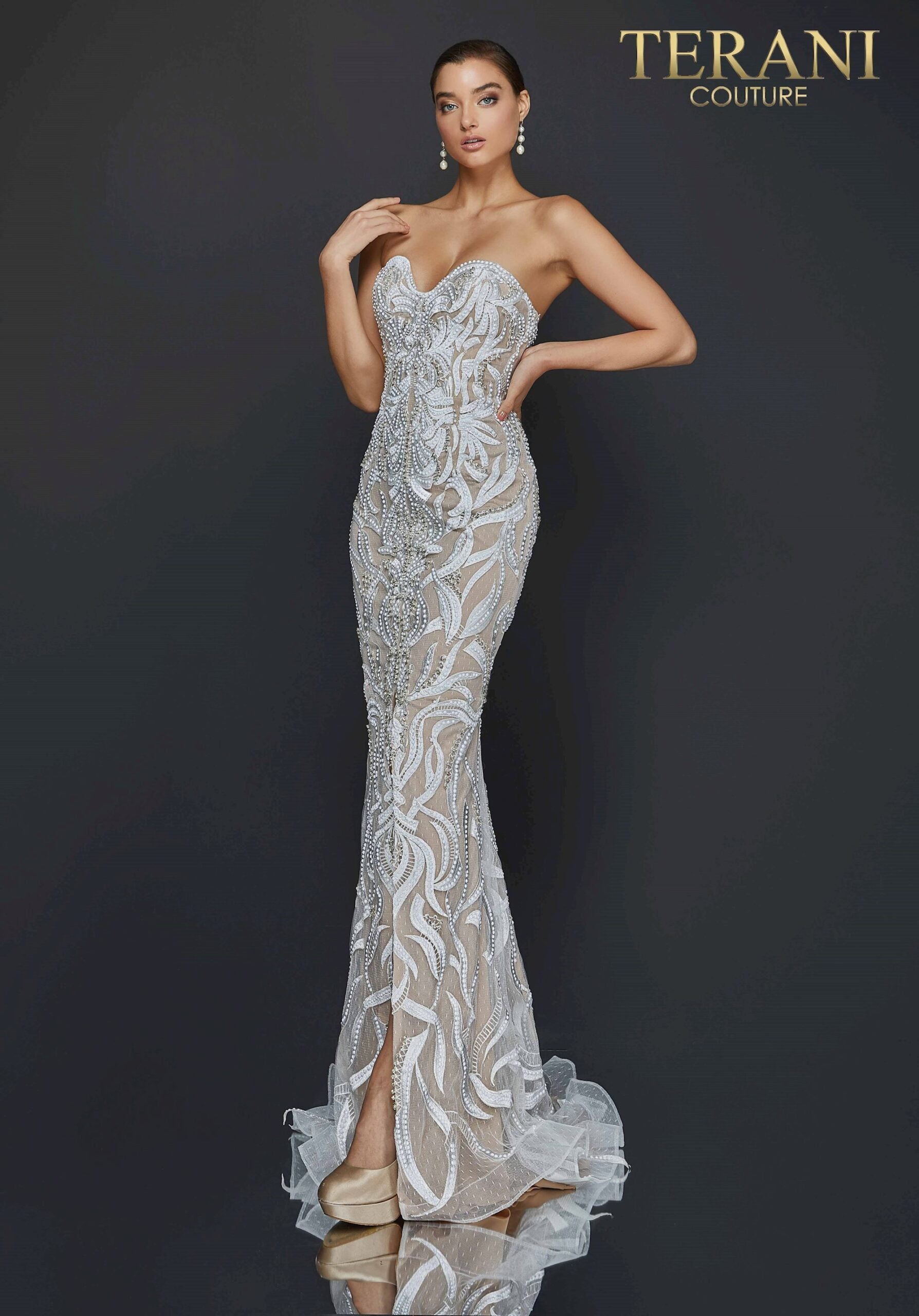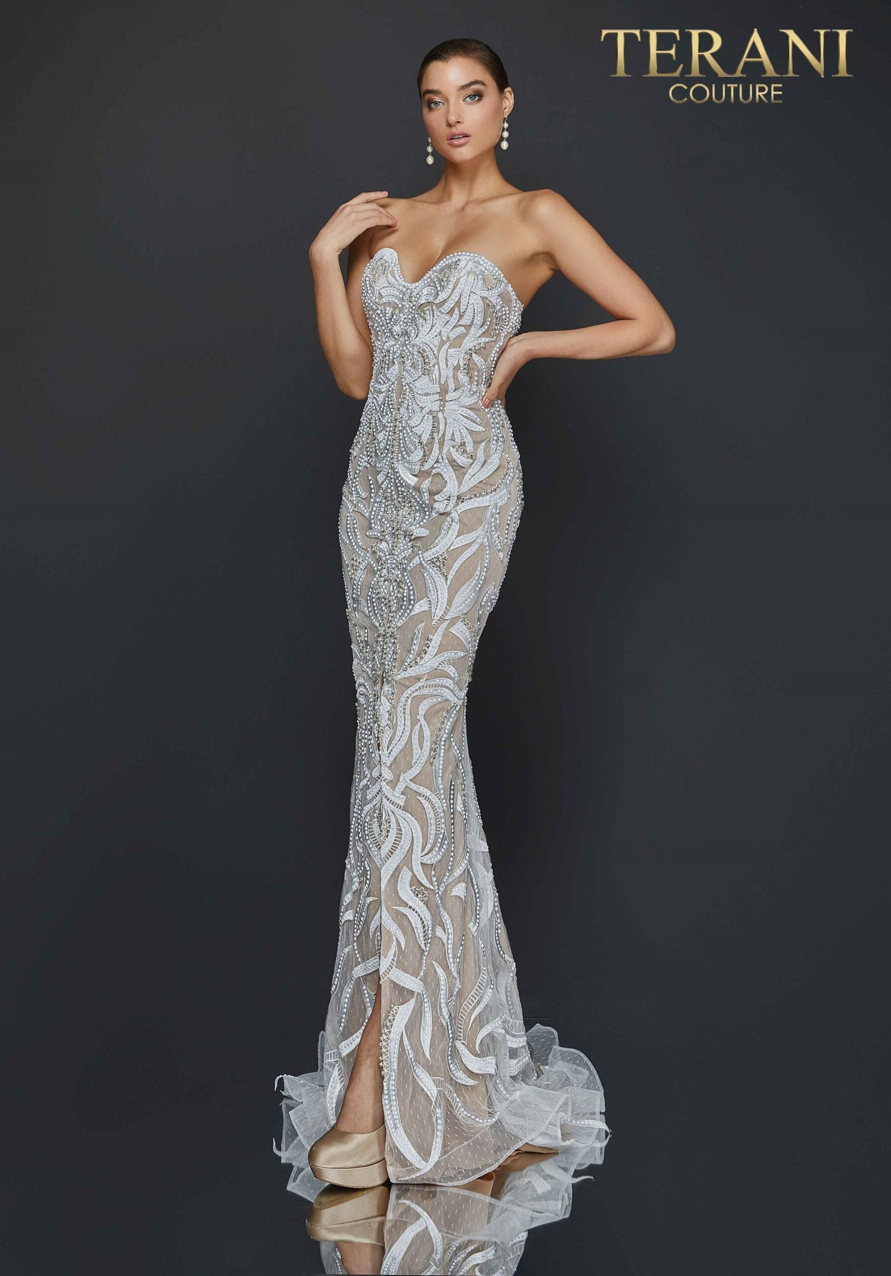 UNK-2011 P1067 is a stunning prom dress from Terani Couture. Available in an elegant Ivory/Nude color combination. This gown is offered in sizes 0, 2, 4, 6, 8, 10, 12, 14, 16, 18, 20, 22, and 24. Retailing for $506.00, this dress ensures a memorable prom night.