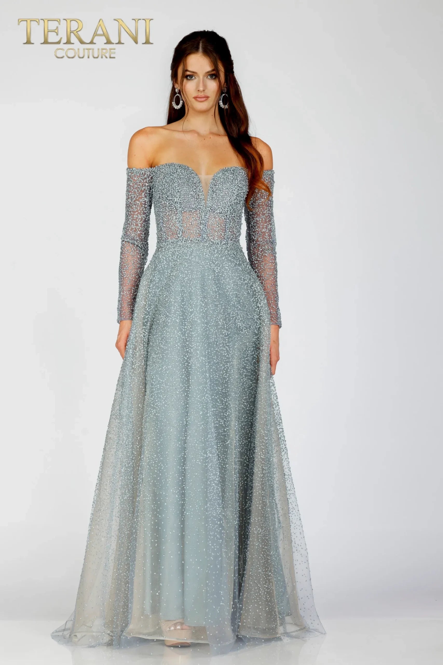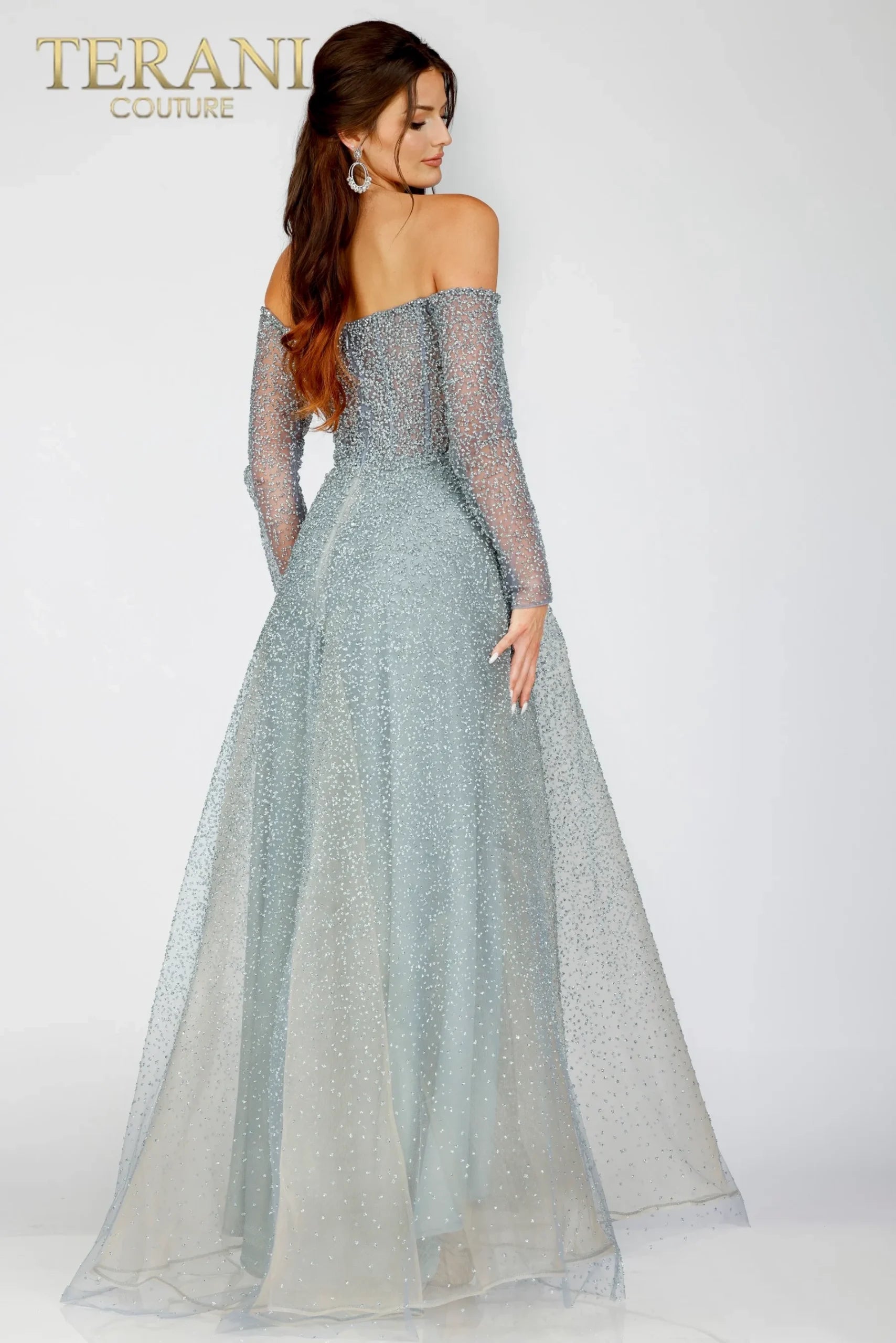 UNK-231 E0519 is a special occasion item from Terani Couture, available in slate. This elegant piece is offered in sizes 0, 00, 10, 12, 14, 16, 18, 2, 20, 22, 24, 4, 6, and 8. The price is $704.00.
