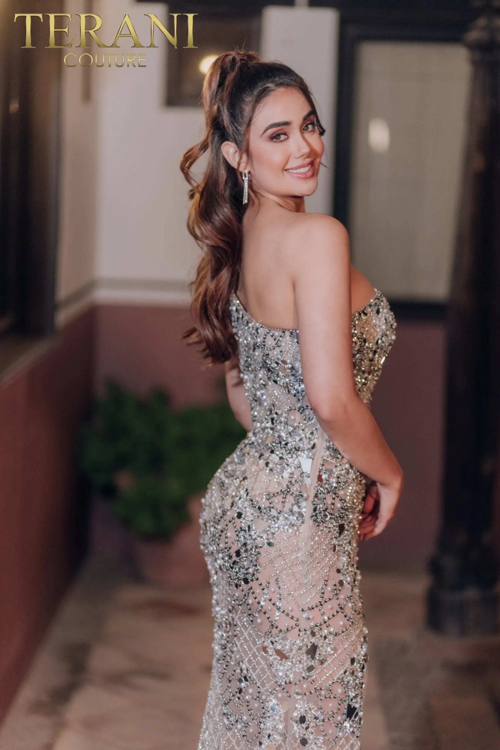 UNK-232 GL1483 is a special occasion gown from Terani Couture. Available in Gunmetal/Silver, this dress is offered in sizes 0, 2, 4, 6, 8, 10, 12, 14, 16, 18, 20, 22, and 24. The price is $1,166.00.