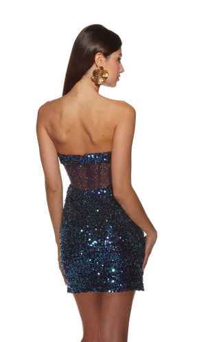 This style features a short dress with a plunging neckline a line silhouette an open back. Designed to feel elegant and confident, it’s a beautiful option for special occasions.