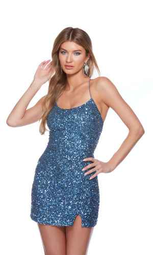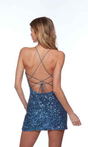 This style features a short dress with a v neck neckline straight strappy back. Designed to feel elegant and confident, it’s a beautiful option for special occasions.