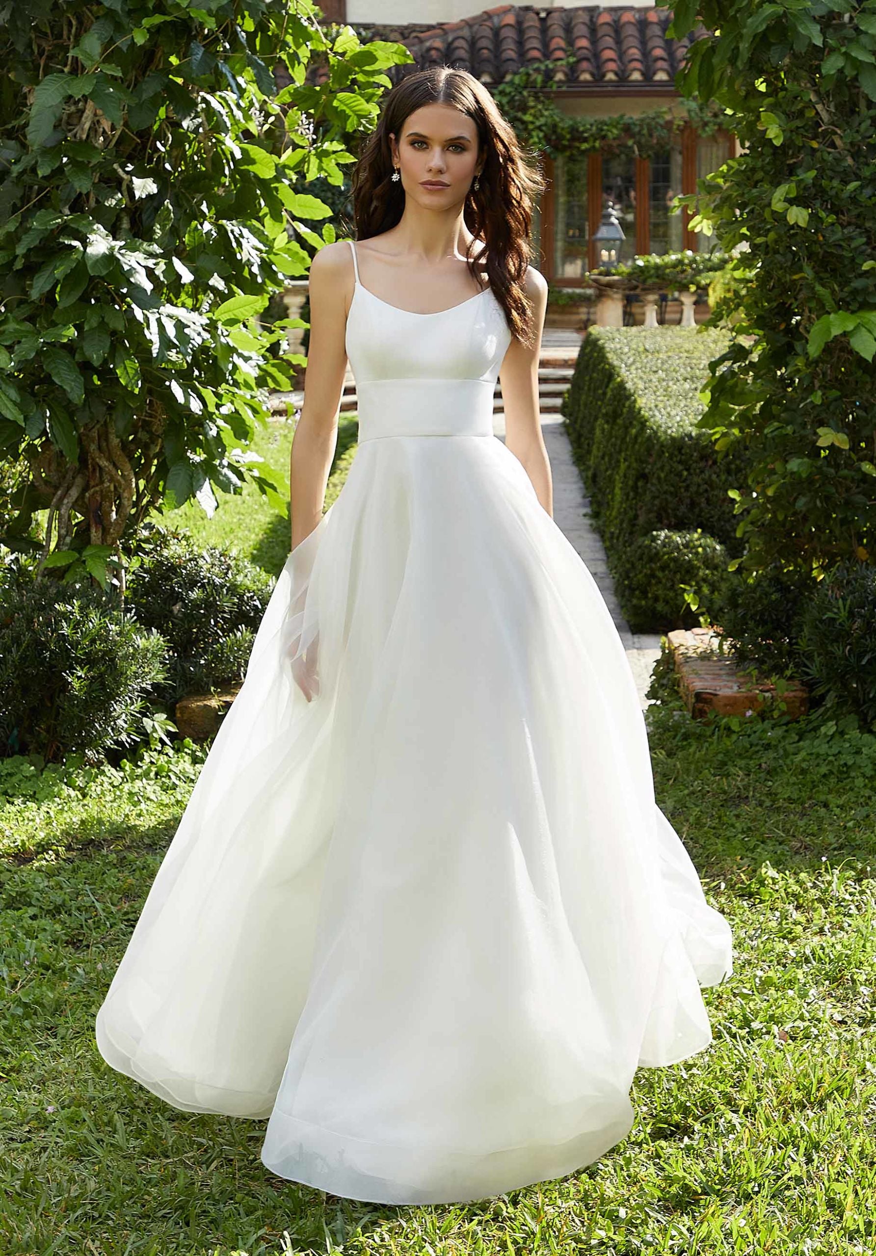 The UNK-Glenda wedding dress, designed by Madeline Gardner for The Other White Dress, is a stunning ball gown silhouette. Crafted from crepe and organza, this floor-length gown features a scoop neckline and delicate spaghetti straps. The natural waist creates a flattering figure. Available in diamond white and sizes 0, 00, 000, 2-24.