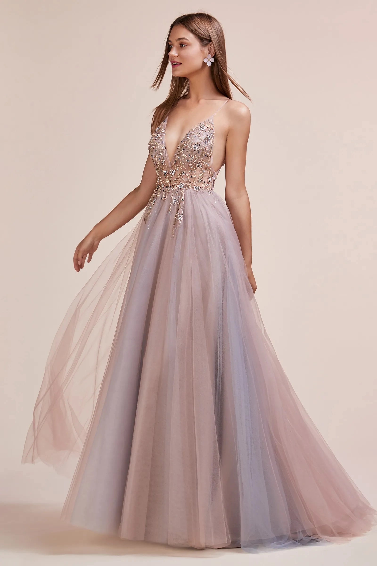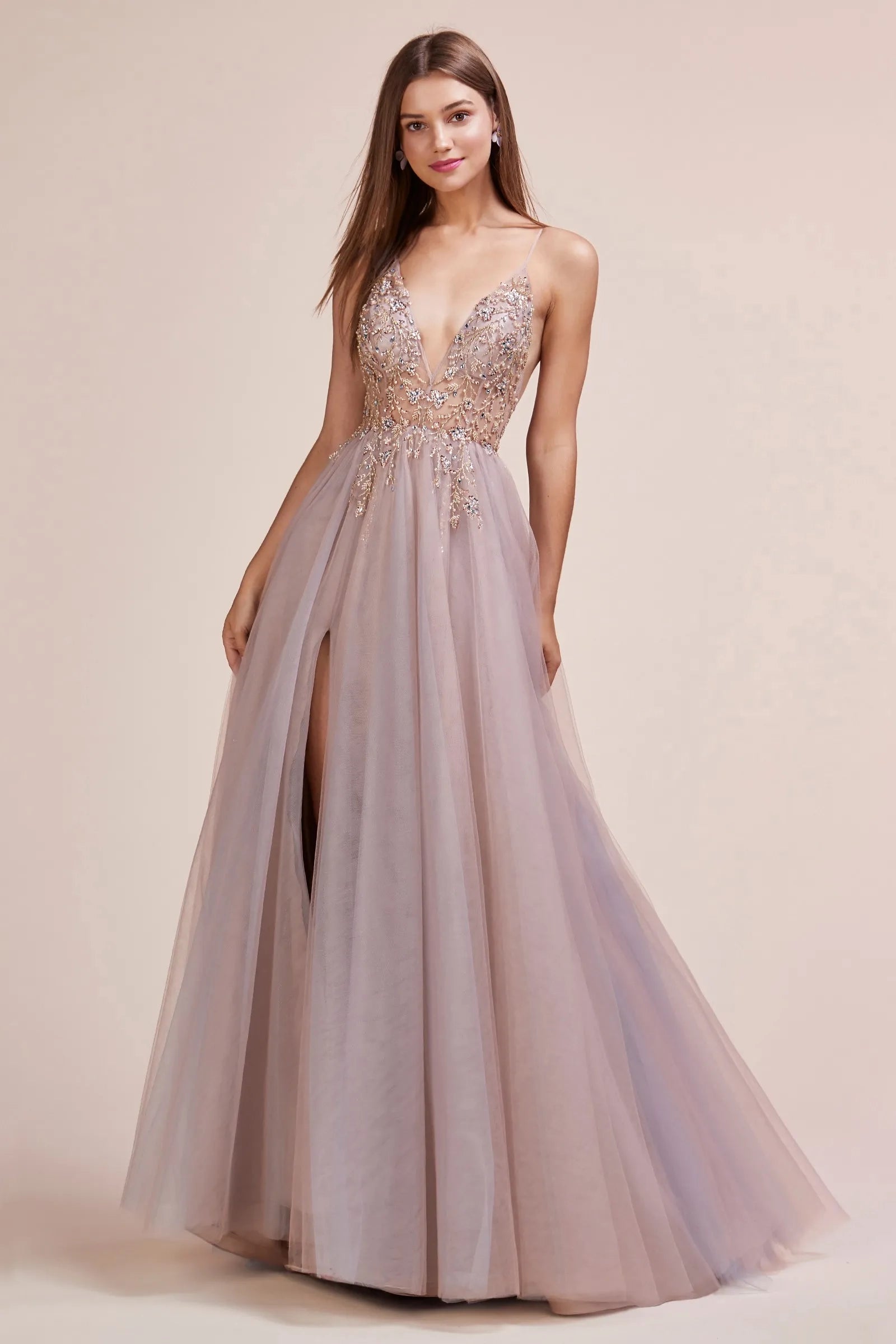 The ALC-A0672 from Andrea & Leo Couture is an elegant choice for bridesmaids or prom. Available in Light Silver, Rosewood, and Smoky Blue, this gown offers sophisticated color options. Offered in sizes 2, 4, 6, 8, 10, 12, 14, and 16. Priced at $195.00.