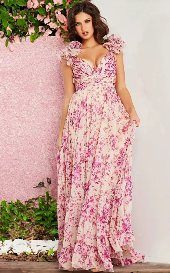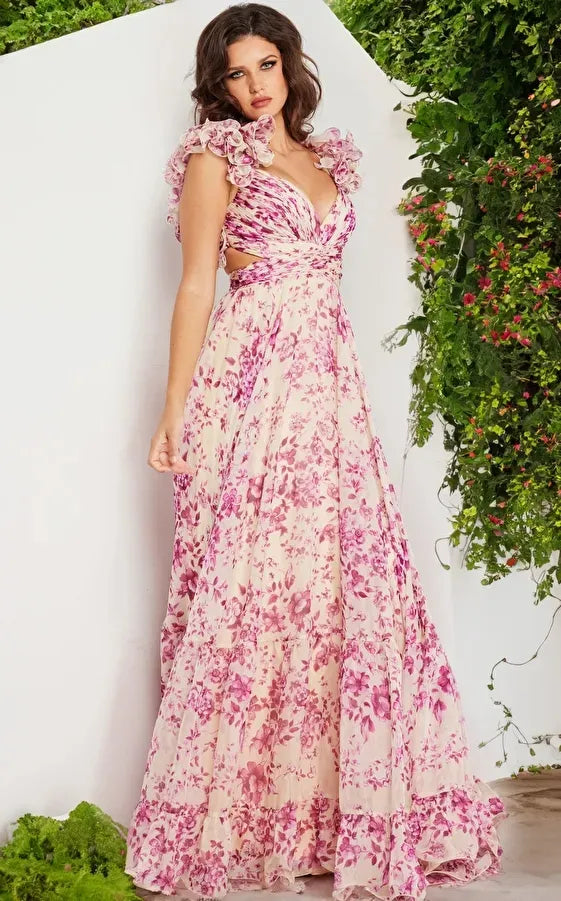 JVN-24139 is a striking special occasion garment from Jovani. This printed dress is available in sizes 0, 00, 10, 12, 14, 16, 18, 2, 20, 22, 24, 4, 6, and 8. The price is $672.00.