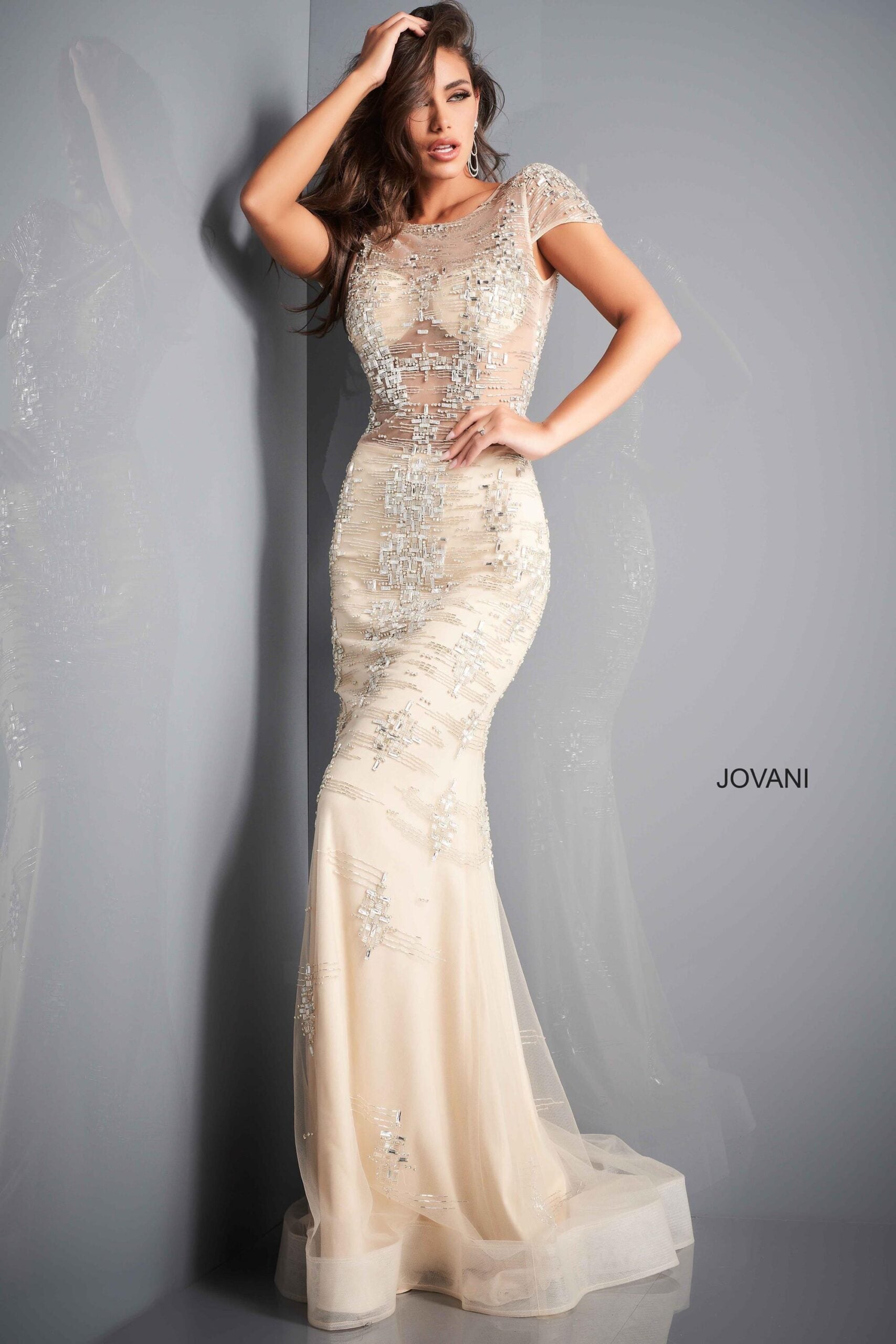 The Jovani JVN-4025 prom dress is available in Nude/Silver. Priced at $1365.00, this elegant gown comes in sizes 00, 0, 2, 4, 6, 8, 10, 12, 14, 16, 18, 20, 22, and 24. This is a regular priced item, currently not on sale.