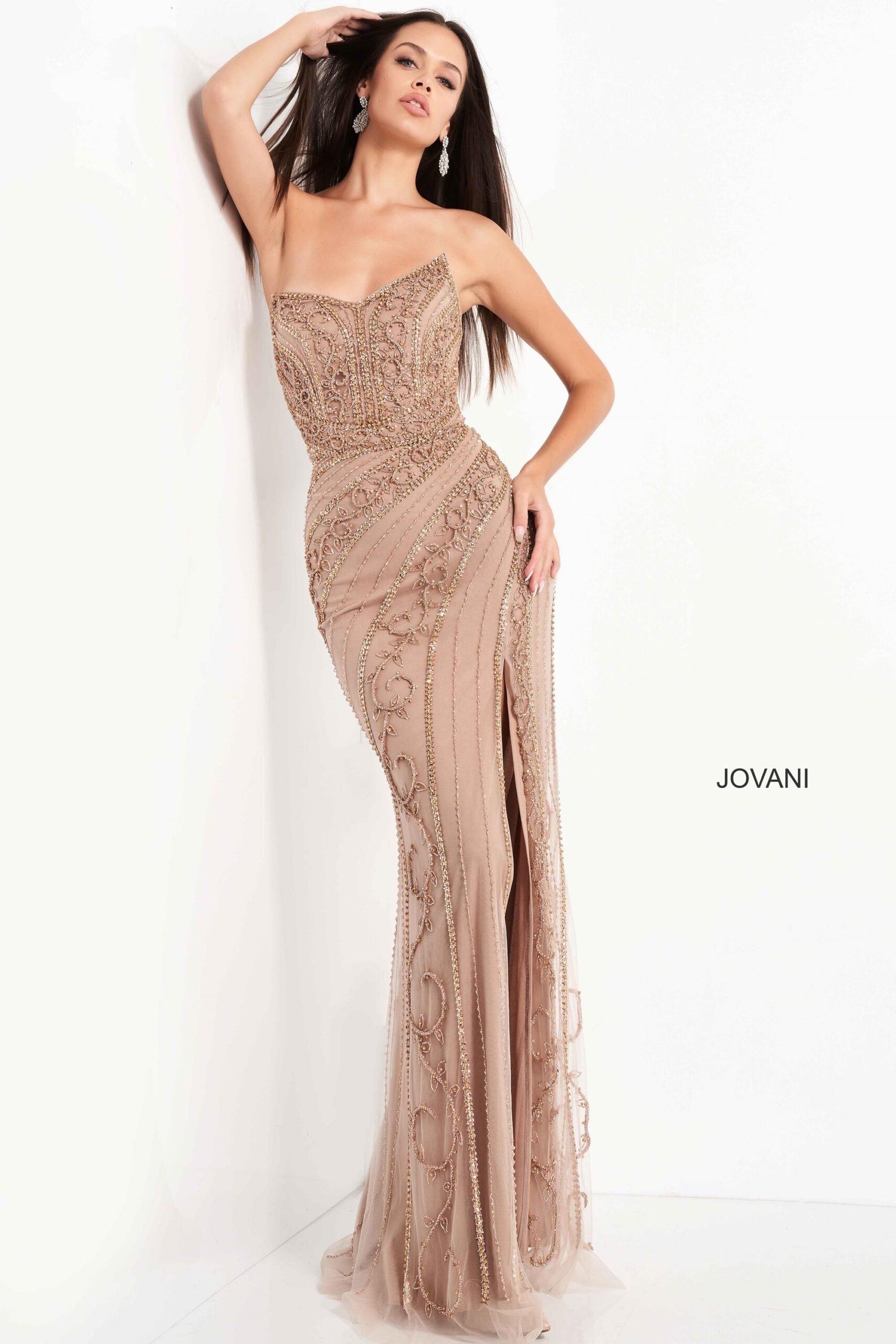 The Jovani JVN-4122 prom dress is a stunning Champagne/Gold gown priced at $1785. Available in sizes 00-24, this elegant design is perfect for your special occasion. No sale price is currently offered.