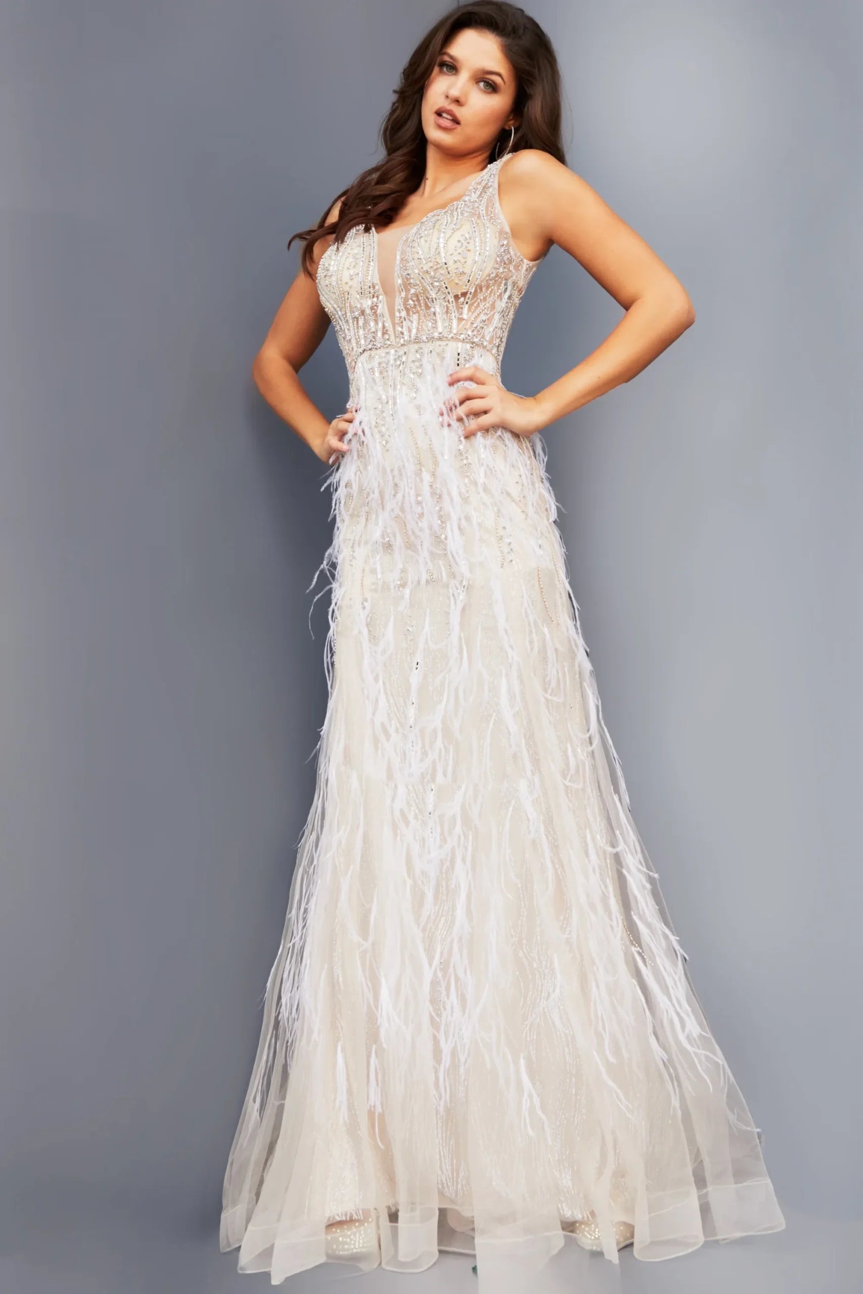 The Jovani JVN-8144 prom dress is available in Beige, Black, Light Blue, Lilac, and Navy. Sizes range from 00 to 24, ensuring a perfect fit. Priced at $788.00, this elegant gown is a sophisticated choice for any prom event. Currently, there are no sales or discounts available on this item.