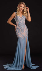 Leave them breathless in this stunning Portia and Scarlett PS21103 creation. Intricately embellished with embroidered details and rhinestones, this gown flaunts a deep v-neckline on a sheer sleeveless bodice. The back has a low scoop design and a zipper closure. Parting with a slit, the flare of its trumpet silhouette ends with a court train. Saunter on the red carpet like a dream in this Portia and Scarlett masterpiece. Models are wearing Black, Powder Blue, and Stone colors