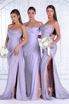 Be a vision of loveliness in this beautiful gown by Portia and Scarlett PS21218. A long special occasion gown with draped fitted bodice, strapless sweetheart neckline with metallic embellishment accenting the left bust. The gown parades a sheath silhouette with a thigh high leg slit and finishes with a sweep train. The gown has a mid-open back with center zipper closure. This Portia and Scarlett dress boasts a fantastic finish for a striking look on your special day, specially fitting the Bridesmaids and Made of Honors. Models are pictured wearing Champagne, Charcoal, Mauve, Silver, Teal, Emerald and Ice variants.