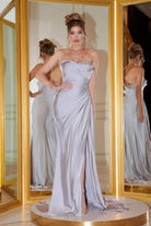 | Details: | Strapless, Beaded bust, Ruching, Drape, High leg slit, Sweep train, Hidden back zipper |