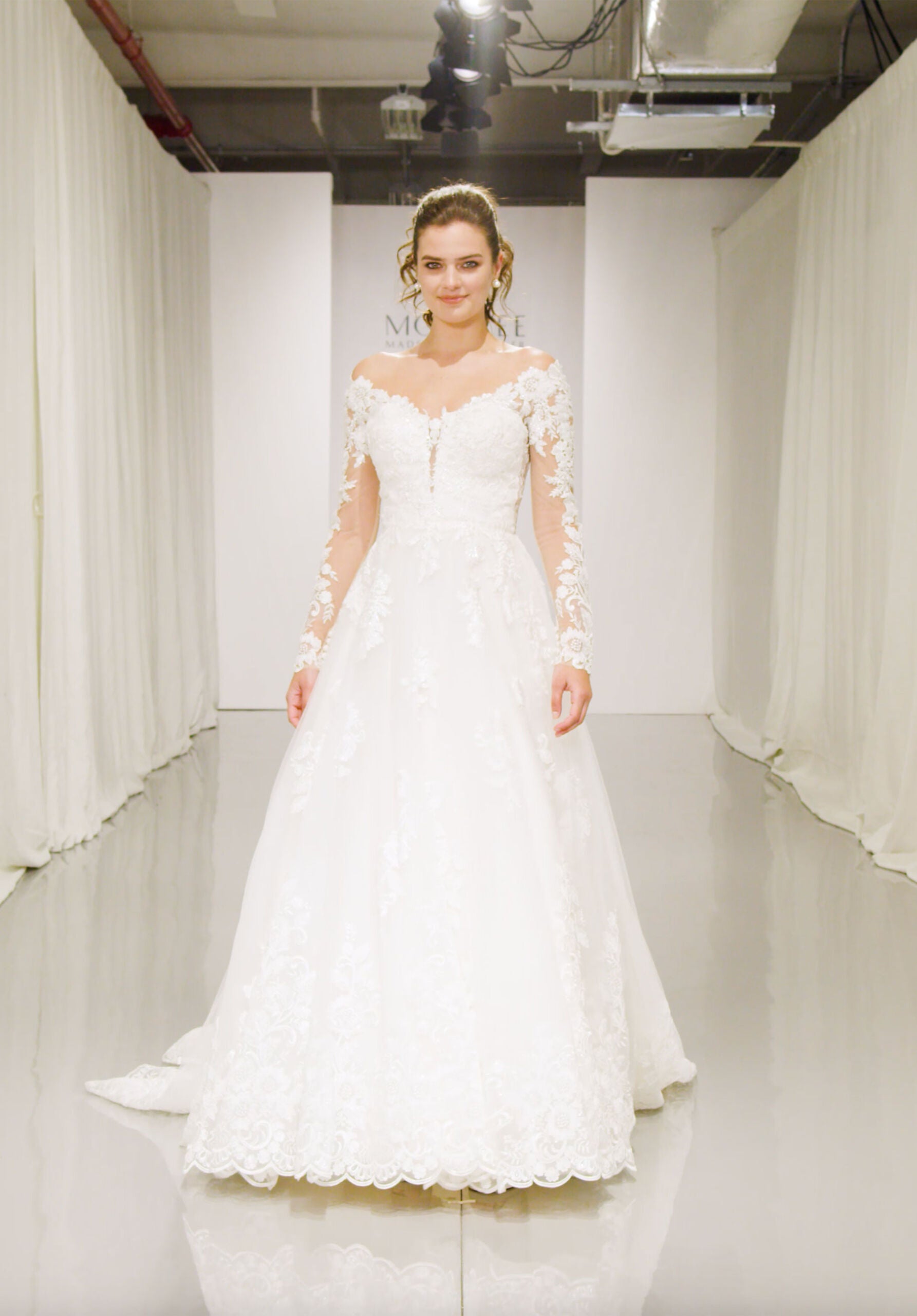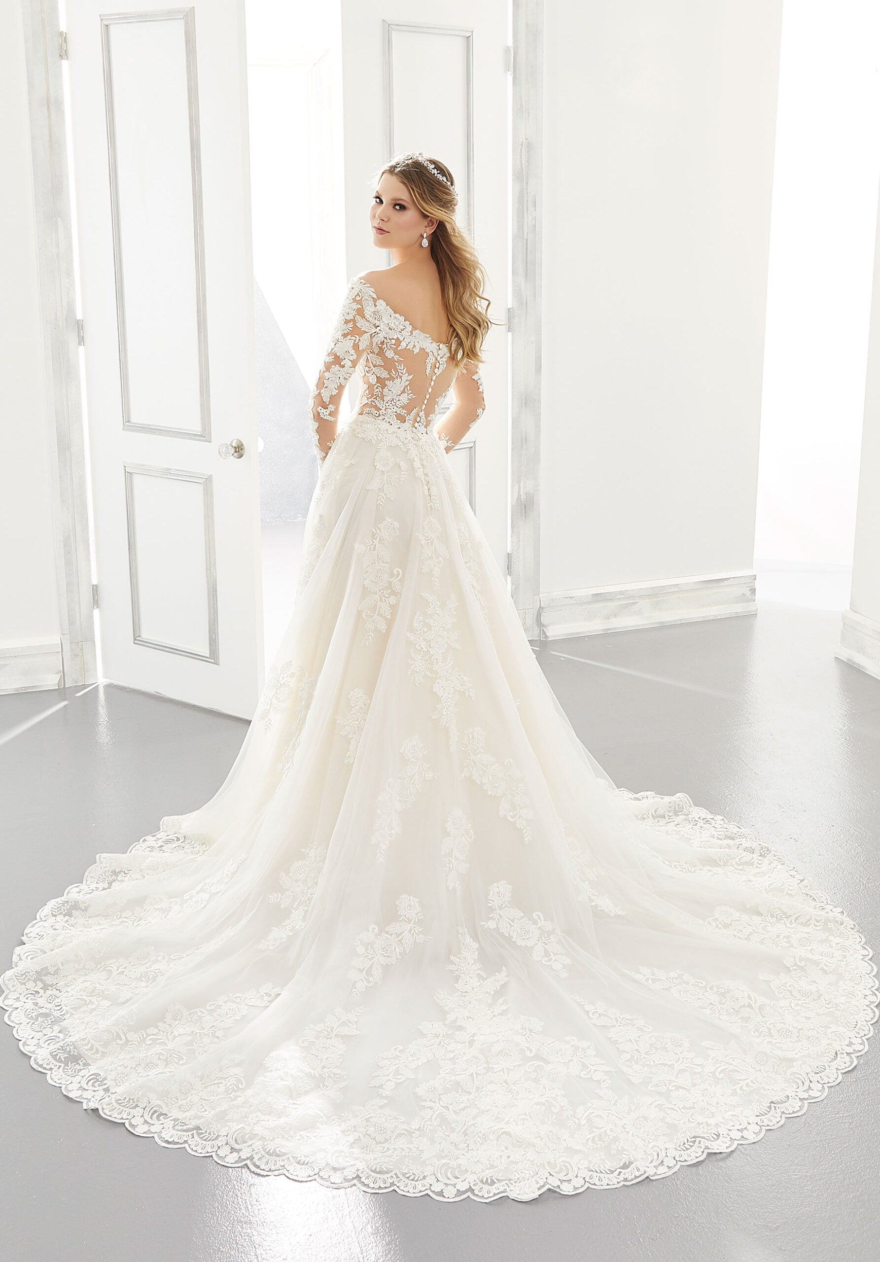 Our Ambrosia gown is a true classic bridal beauty. Featuring a stunning off the shoulder long sleeved bodice, accented in frosted Alencon and embroidered appliqués that cascade onto the Tulle Ball Gown skirt. An intricate illusion back and wide scalloped hemline complete the look. Available in three lengths: 55″, 58″, 61″. Available in sizes 16W-32W as Style 2196W. Styled with Headpiece HP4072. Shown in Ivory/Champagne/Honey.