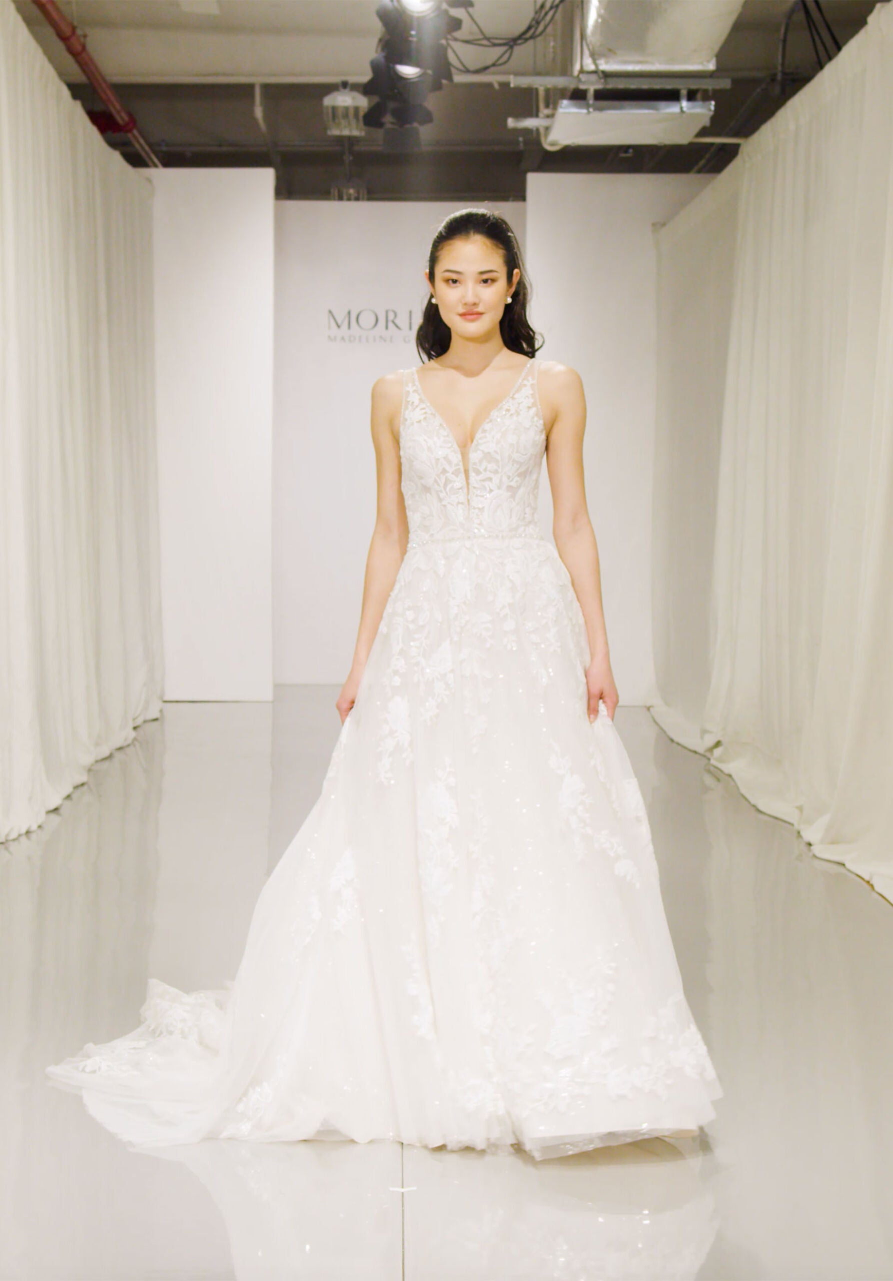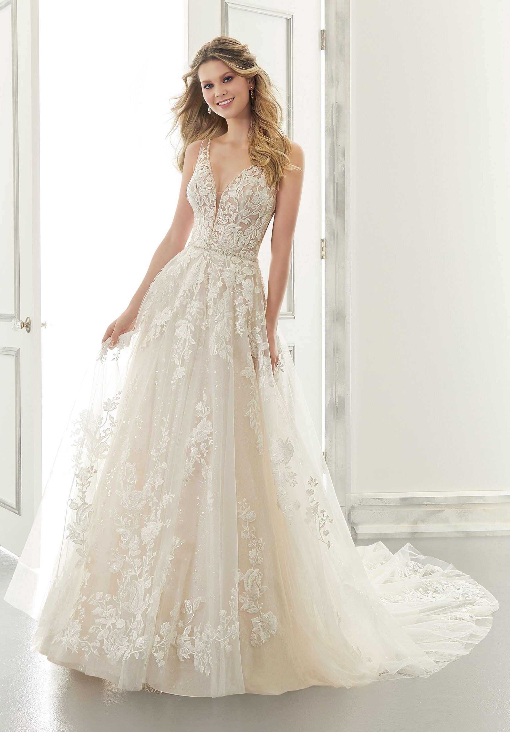 A modern take on a classic silhouette, our Ana wedding dress features a V-neck bodice accented in moonstone and crystal beading that also trims the natural waistline. Frosted, embroidered appliqués adorn the Tulle Over Sequined Tulle A-Line Ball Gown for a truly dazzling effect. A plunging V-back and wide hemline border complete the look. This gown can be worn with or without the detachable Sequined Tulle underskirt. Available in three lengths 55″, 58″, 61″. Shown in Ivory/Creme/Honey.