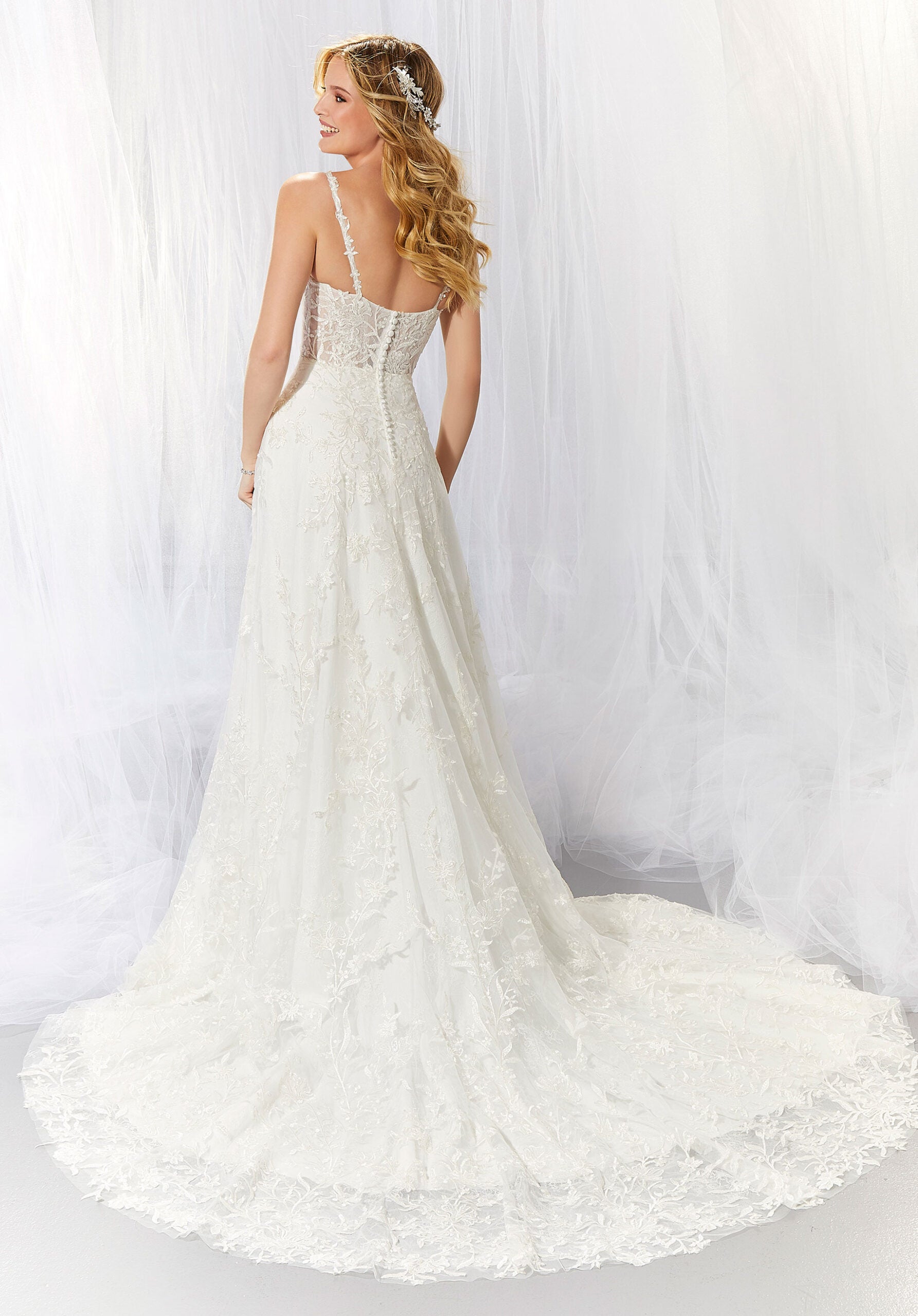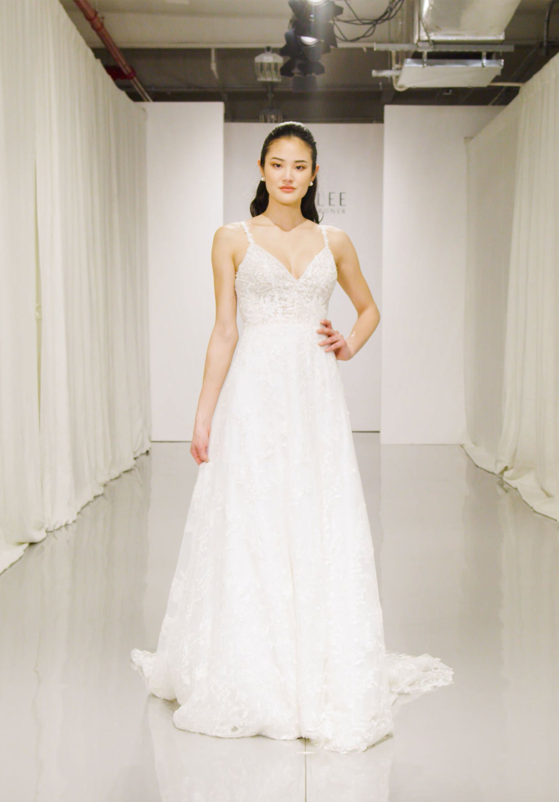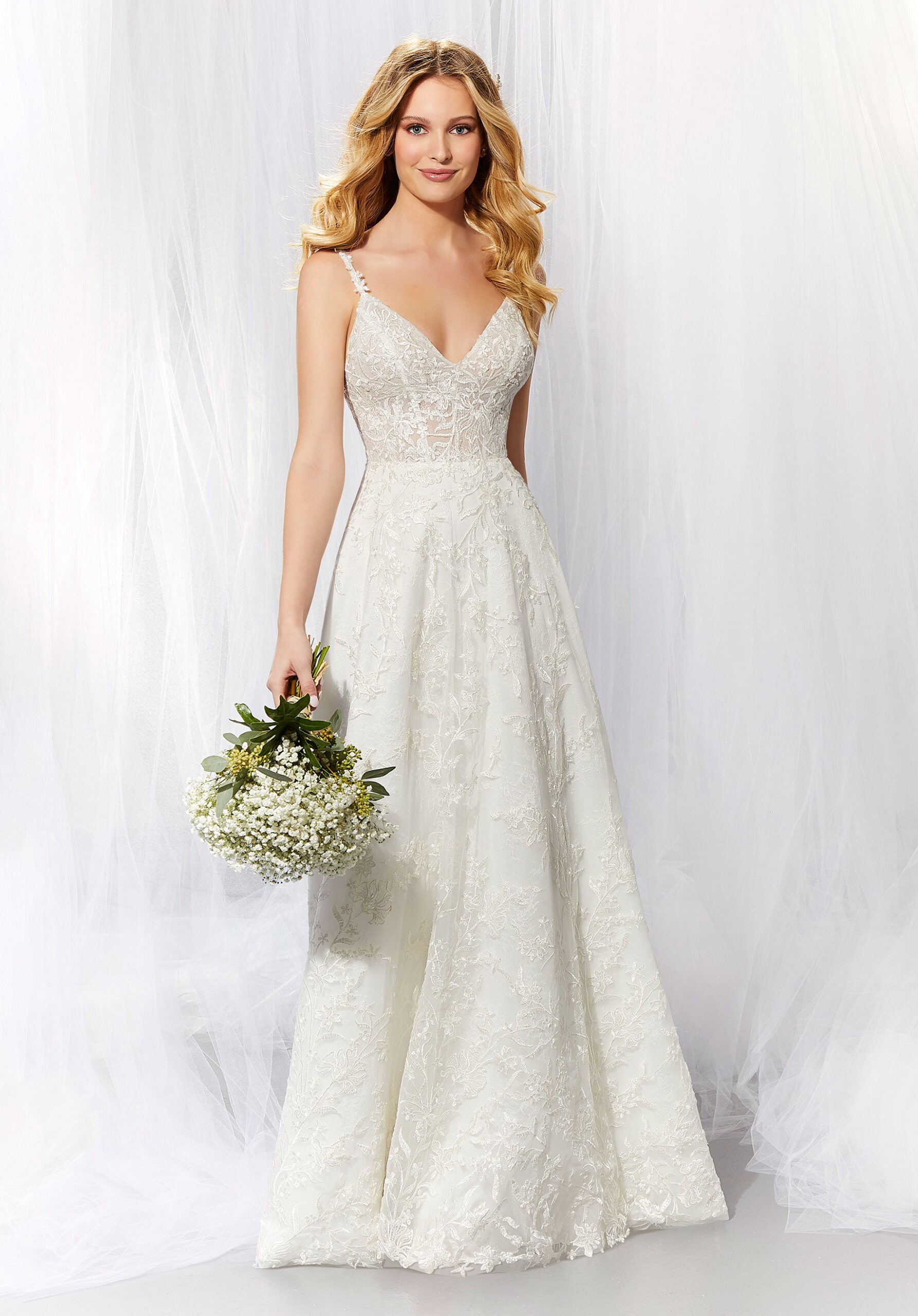 Voyagé UNK-April wedding dress. An ivory gown featuring a flattering V-neckline and natural waist. Sleeveless design with a long length. Available in sizes 0, 00, 000, 2, 4, 6, 8, 10, 12, 14, 16, 18, 20, 22, and 24. Designed by Madeline Gardner.