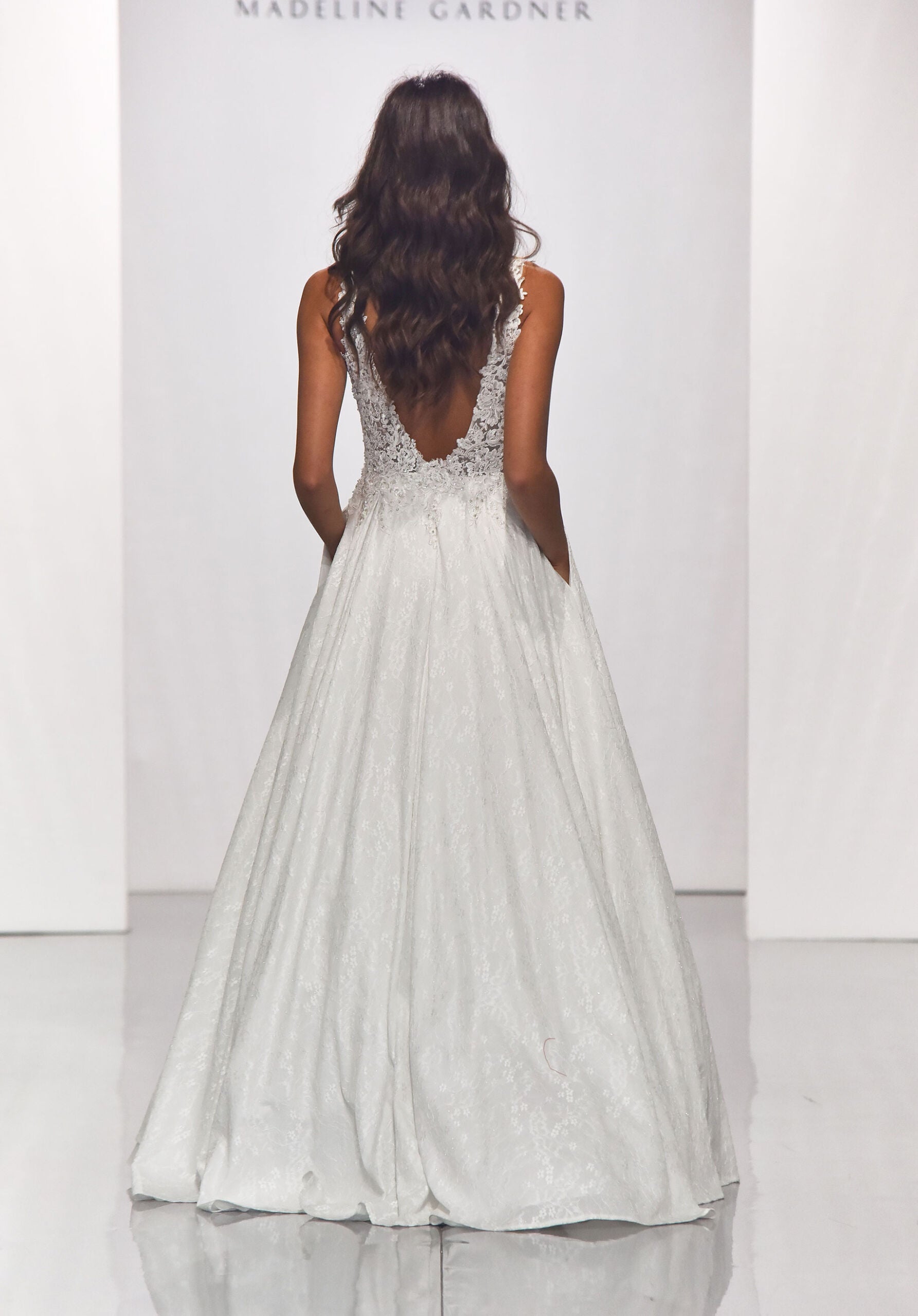 The UNK-Betsey wedding dress, from the Voyagé collection by Madeline Gardner, is an elegant floor-length gown. This ivory dress features a flattering V-neckline, a natural waist, and sleeveless styling with straps. Available in sizes 0, 00, 000, 2, 4, 6, 8, 10, 12, 14, 16, 18, 20, 22, and 24.