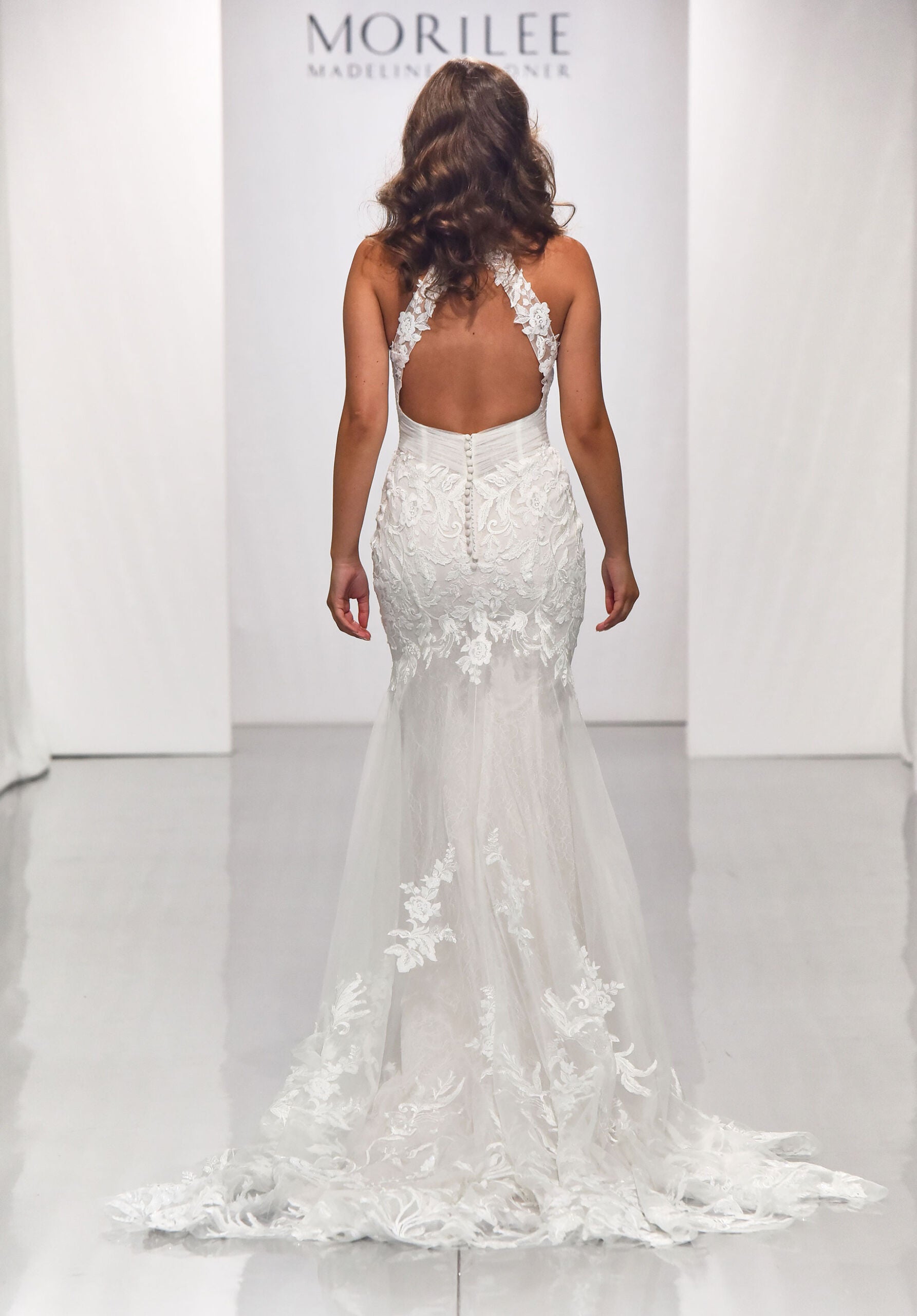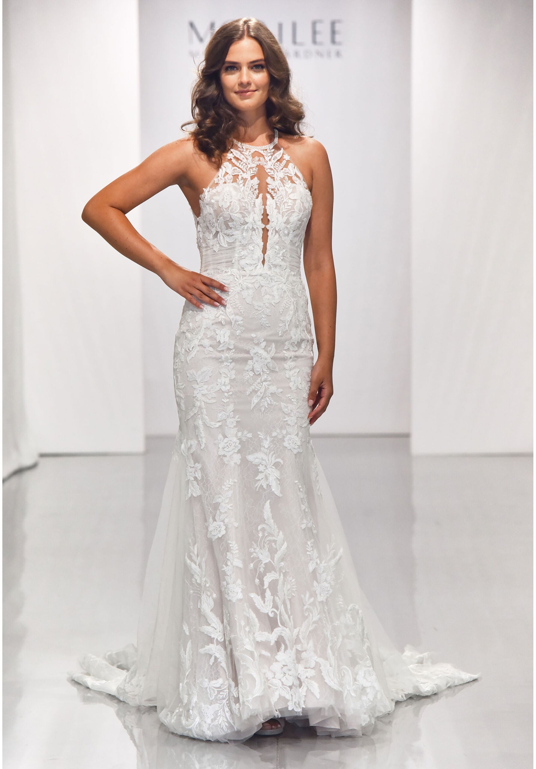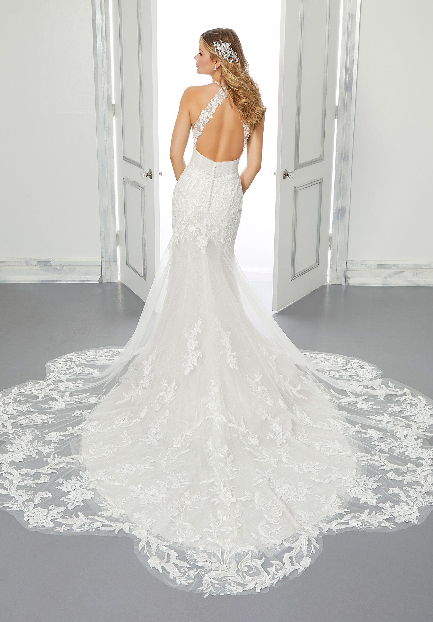 Our Bonita wedding dress is a mesmerizing fit to flare gown with frosted embroidered appliqués on Net over Chantilly lace. Its high-halter neckline is trimmed in pearl and moonstone beading and the bodice has a sheer plunging detail. The gown’s show stopping feature is its open keyhole back accented by gorgeous floral appliqués and sheer, petal train. Available in three lengths 55″, 58″, 61″. Shown in Ivory/Sand/Honey.
