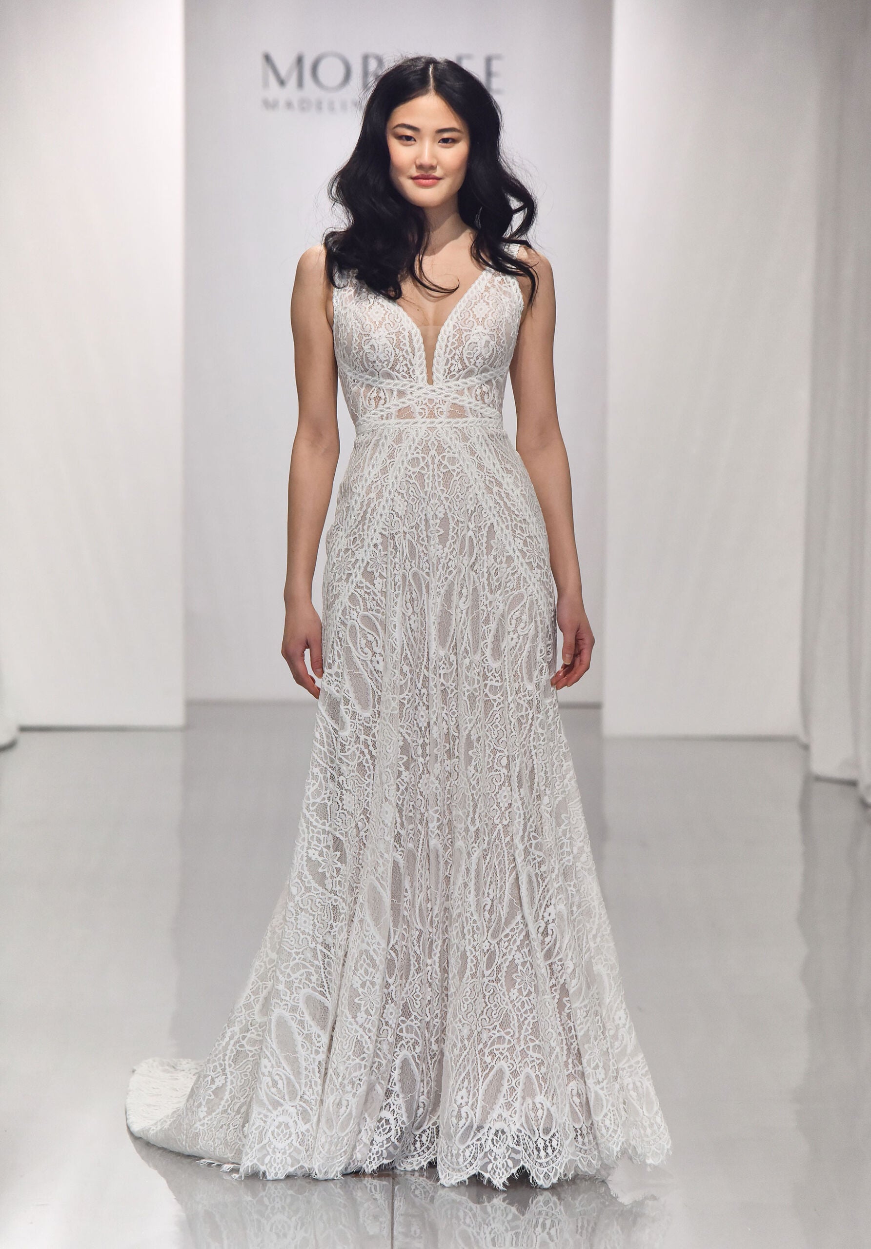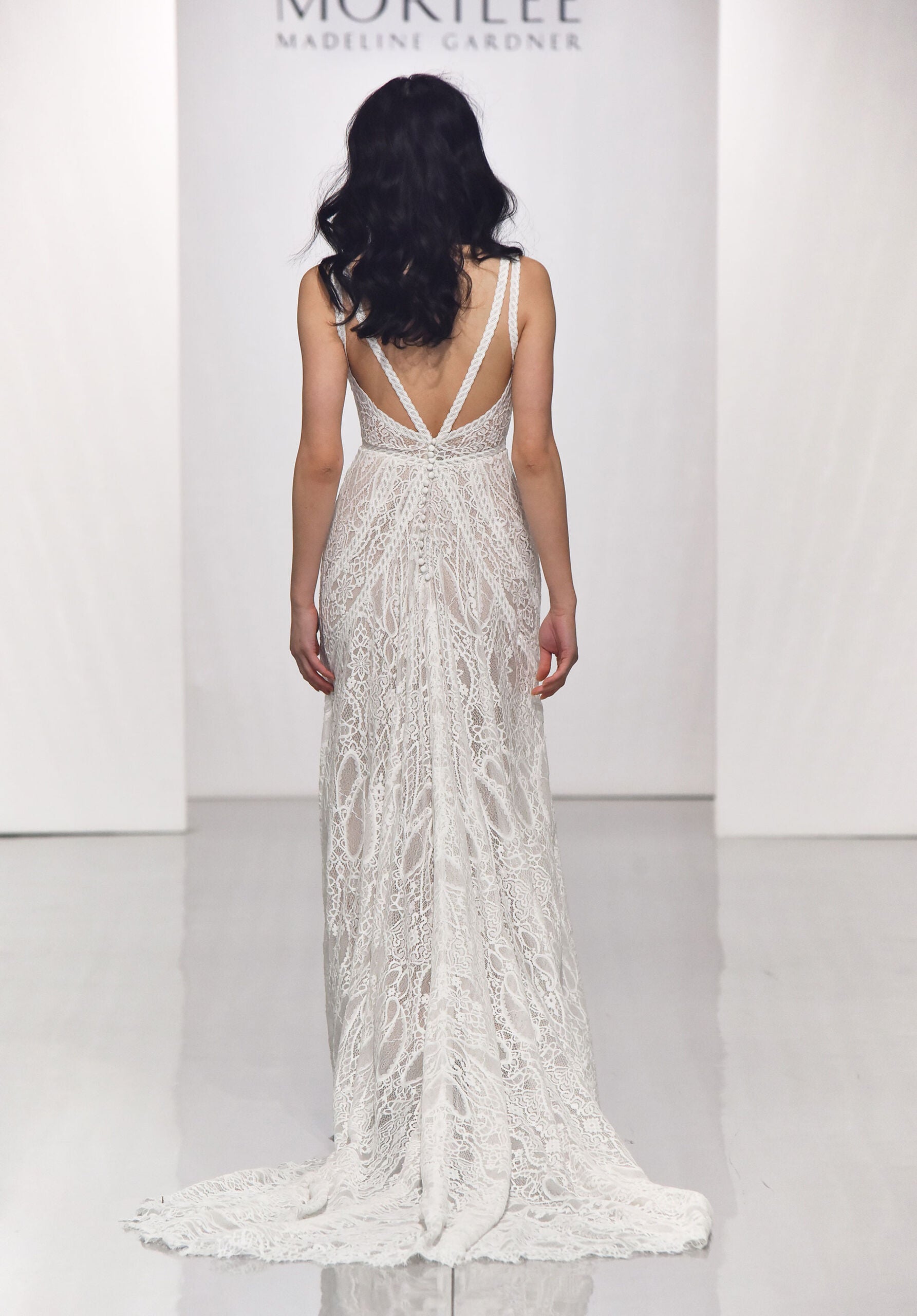 Our Brooke wedding dress is a boho inspired beauty with its effortless A-line silhouette and intricate Lace. Accented by braided Lace trim and straps that double in the back to create a geometric back detail. A fine scalloped hemline and sheer train complete this free-spirited look. Available in three lengths: 55″, 58″, 61″. Shown in Ivory/Cappuccino/Honey.