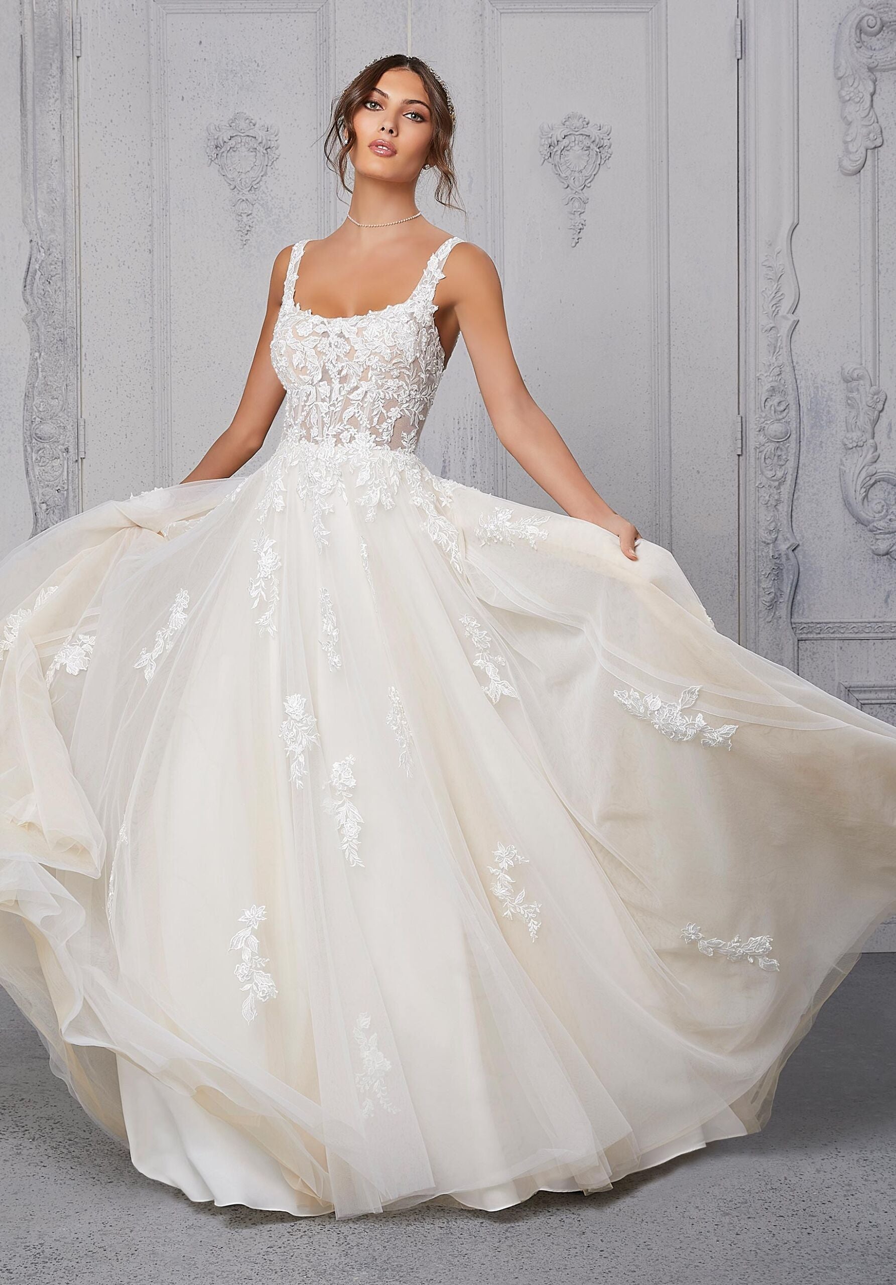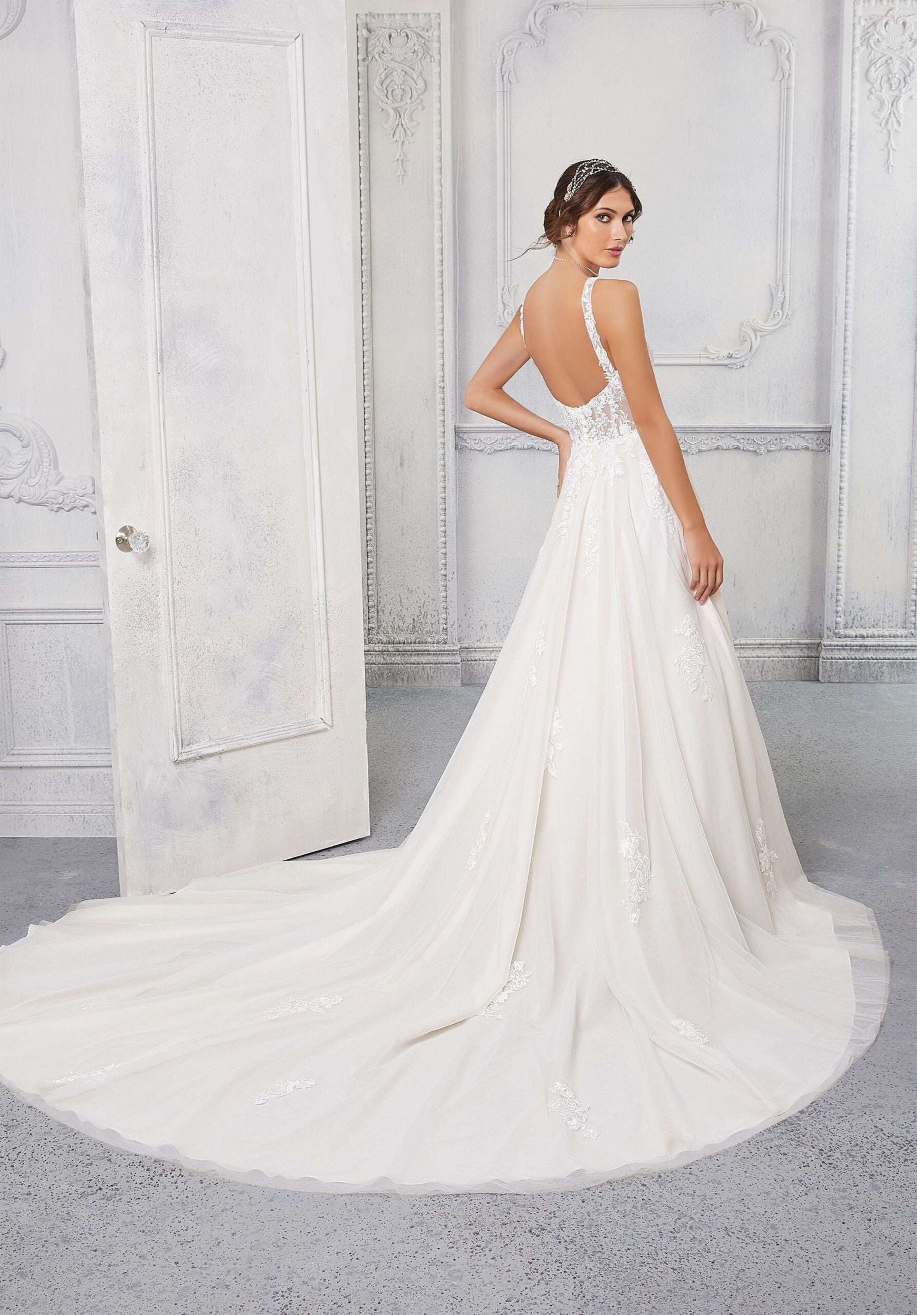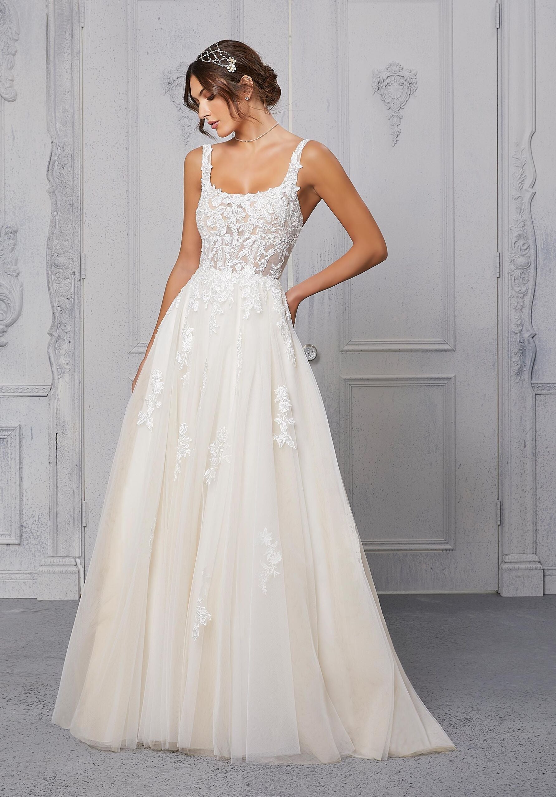 We get fairytale feels looking at our Cassandra wedding dress. From the sheer, boned bodice full of sparkling crystal beaded, embroidered lace, to the soft tulle A-line, ball gown skirt. With chic details like the square neckline and open back, she’ll be a dream to walk down the aisle in. Shown in Ivory/Prosecco/Honey. Styled with Headpiece HP4086.