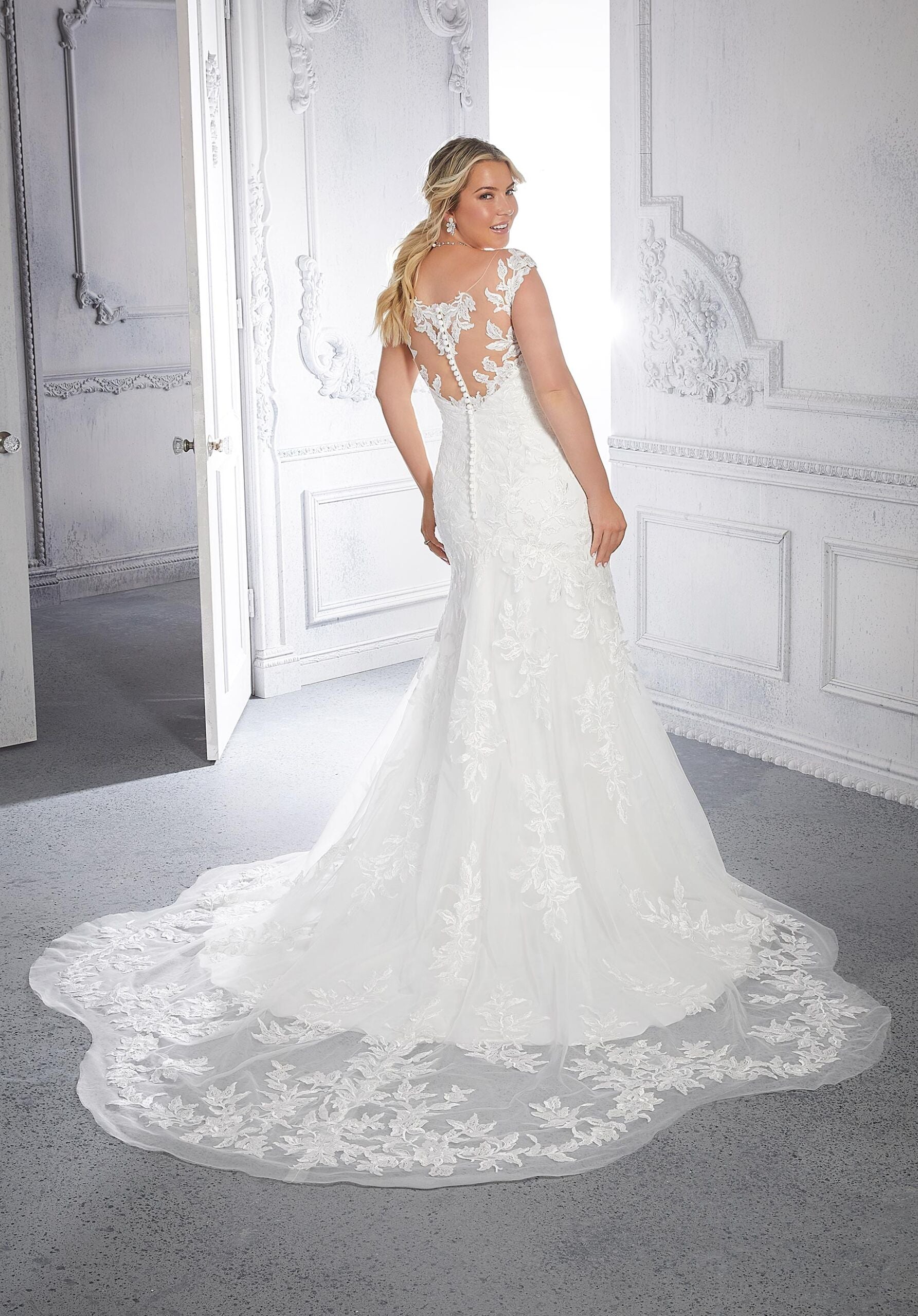 Cathy is the total package with her sultry fit and flare silhouette and gorgeous frosted, embroidered appliqués. The sheer, off-the-shoulder neckline gives way to a beautiful illusion back, lined with dainty covered buttons. An ethereal, sheer petal train completes this darling dress. Shown in Ivory/Honey. Available in three lengths: 55″, 58″, 61″.