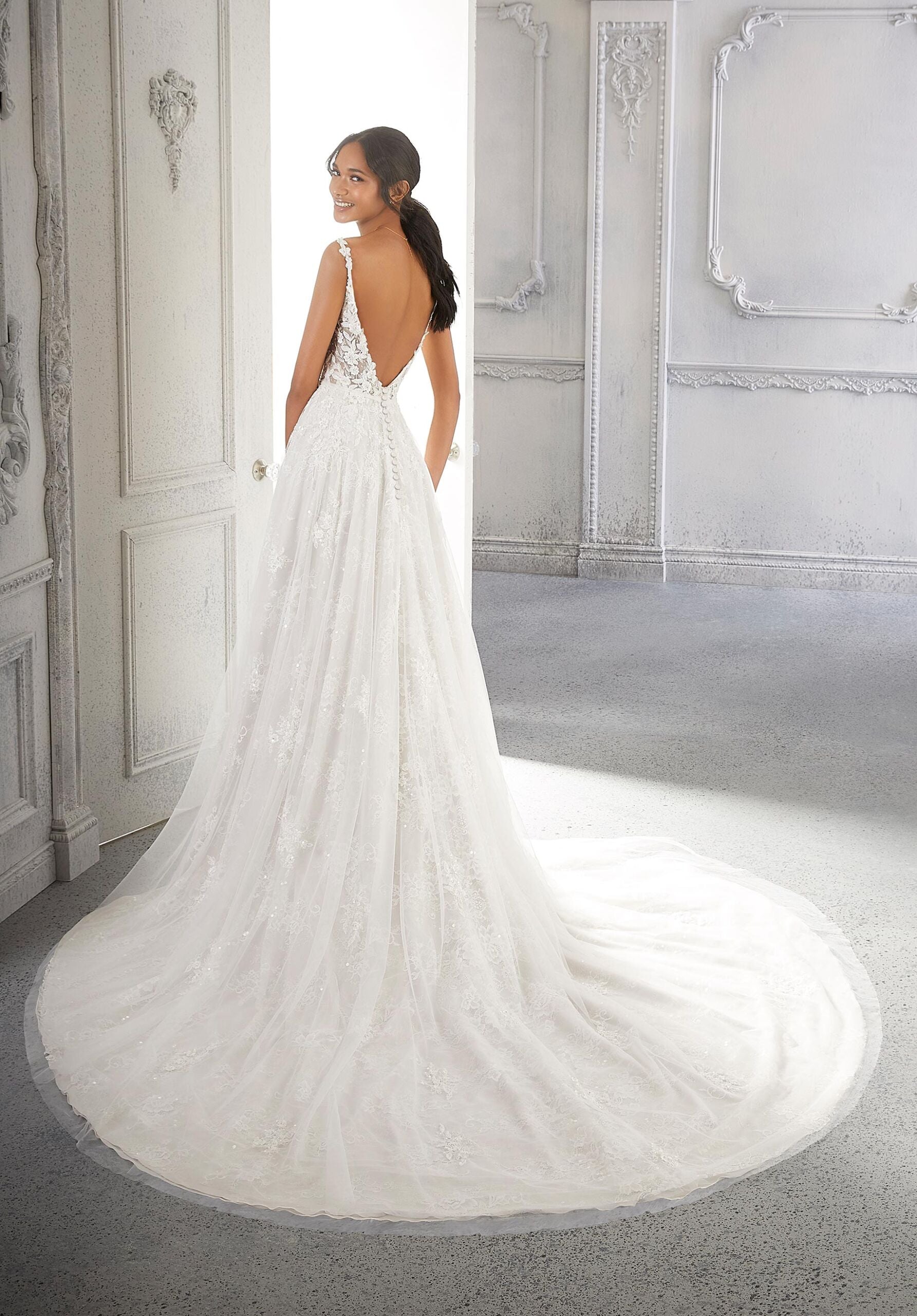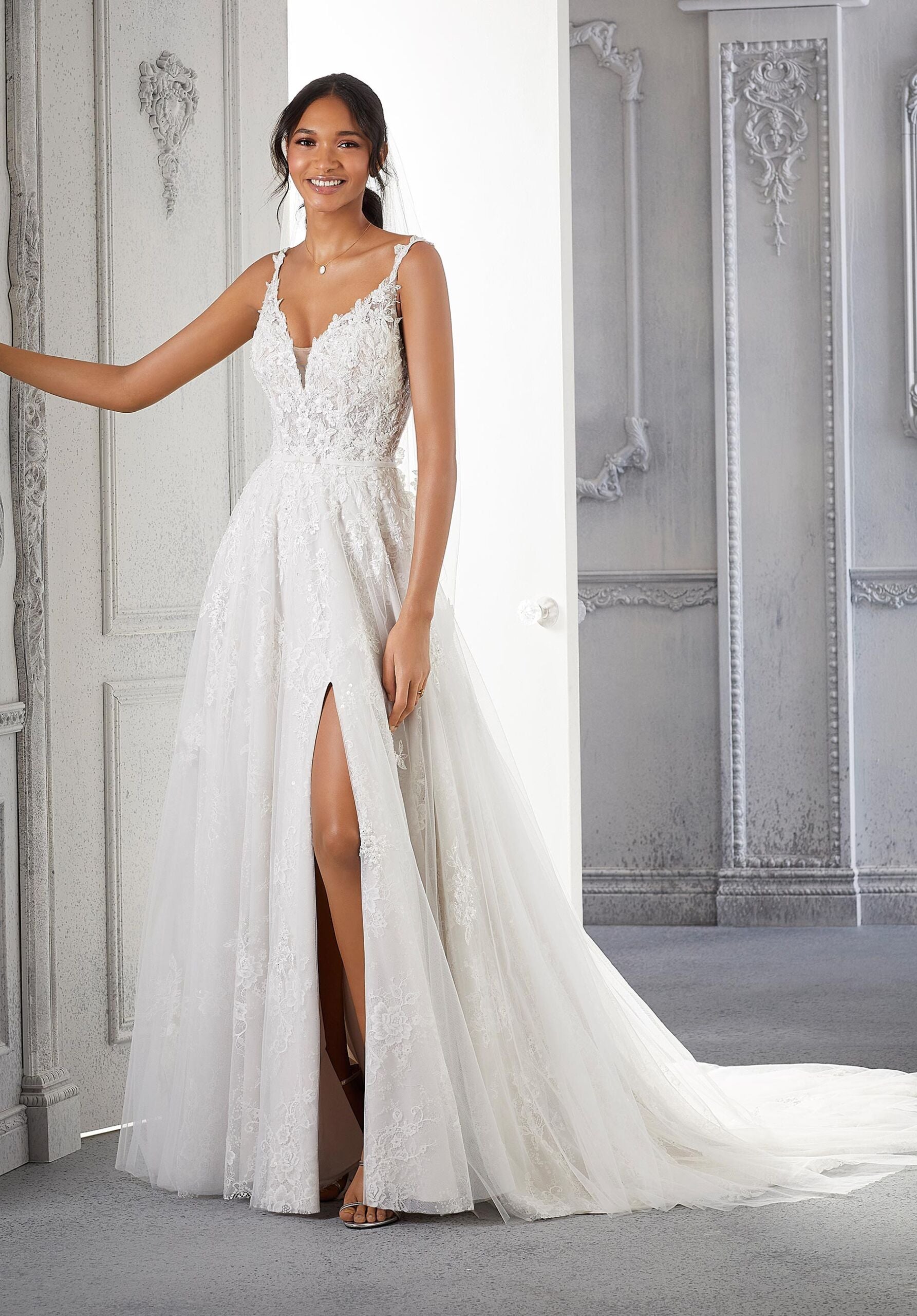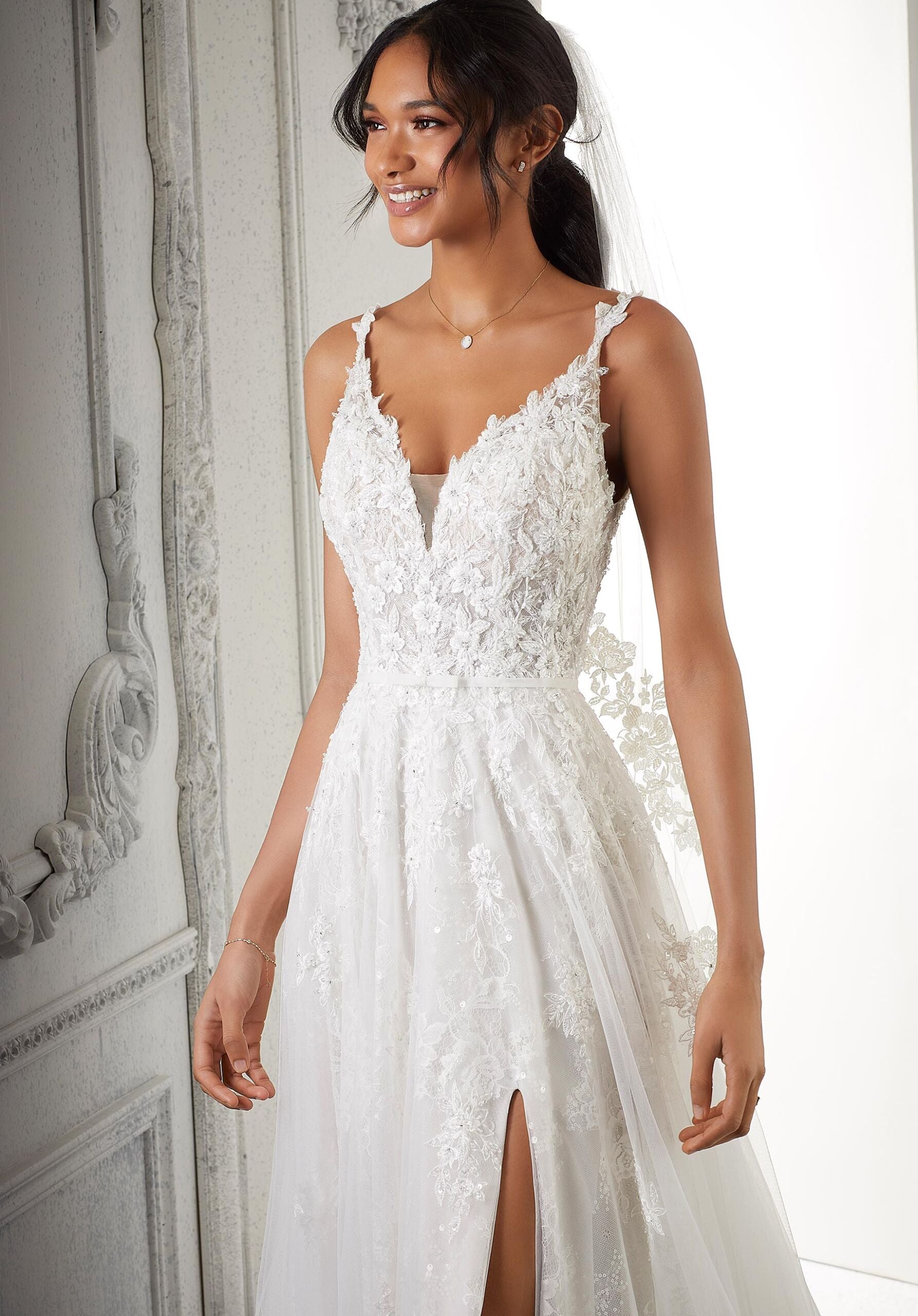 A twist on traditional bridal, Clementina is a flowing sequined, Chantilly lace A-line with trendy elements. The delicately embroidered bodice is covered in clear and crystal beading for a pop of shimmer, and embroidered straps lead to an exposed v-shaped back. Covered buttons and a dainty bow belt keep the gown traditional, while the front skirt slit gives an edge to the gorgeous gown. Shown in Ivory/Almond/Honey.