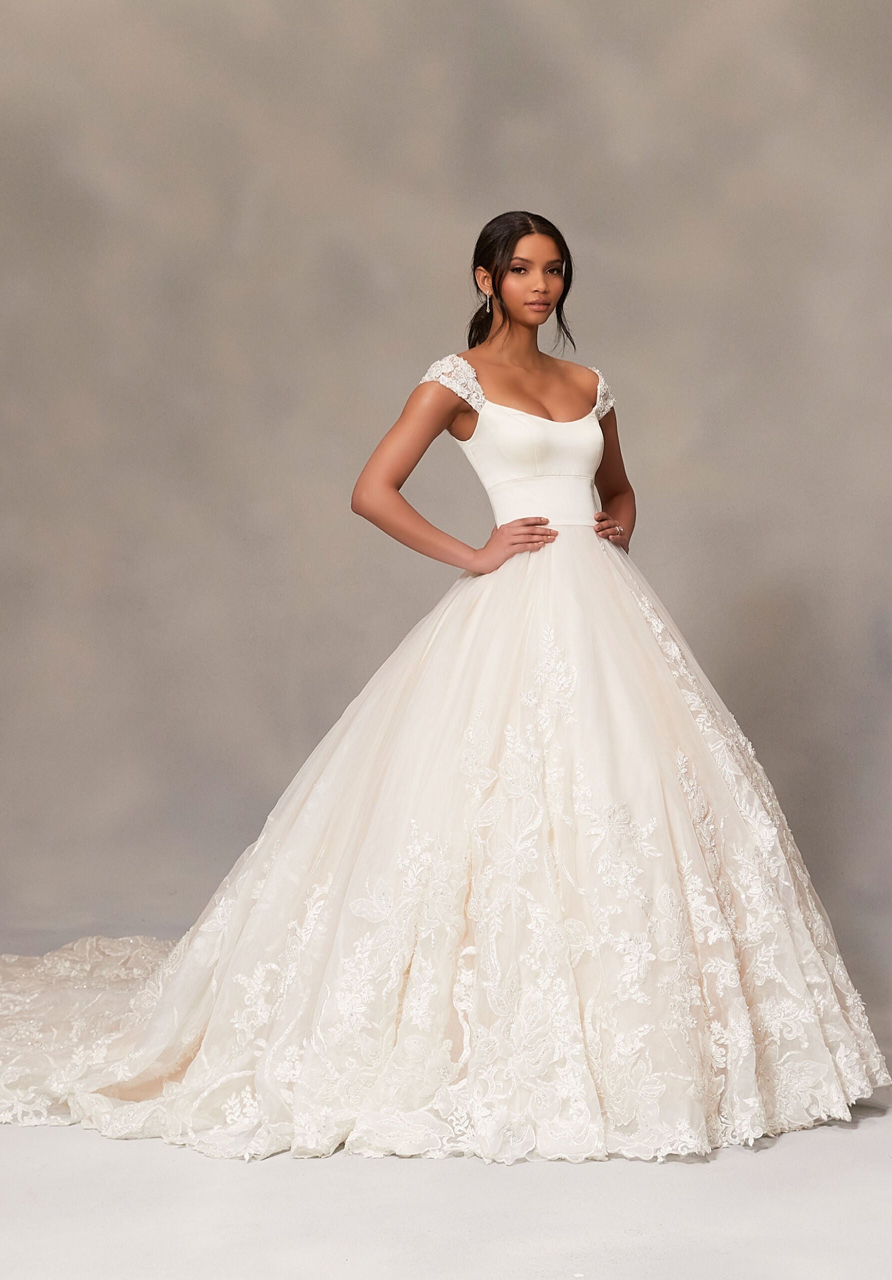 The UNK-Countess wedding dress, from the Signature Collection by Madeline Gardner, is a stunning ball gown silhouette. This floor-length gown features an elegant off-the-shoulder neckline and delicate cap sleeves. The natural waist creates a flattering figure. Available in Ivory/Champagne and sizes 0, 00, 000, 2-24, 10-18. Price range $2000-$6500 USD.