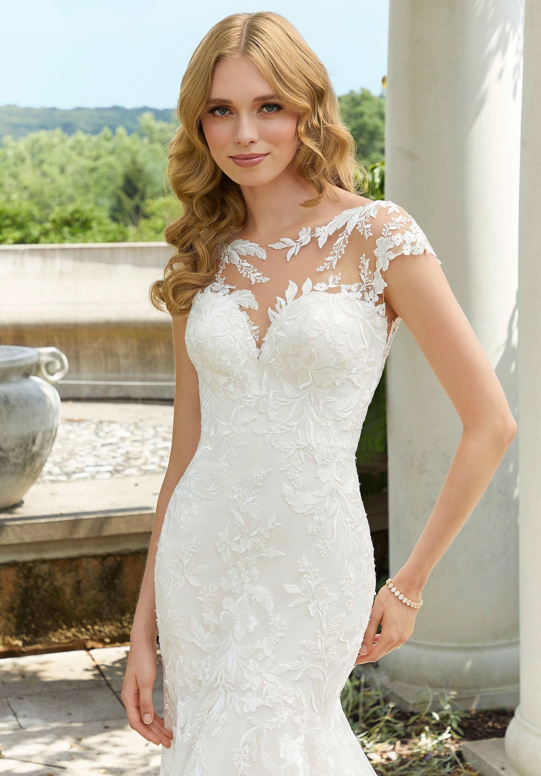 Our Daisy wedding dress is what bridal dreams are made of. The elegant gown features an illusion bateau neckline with delicate cap sleeves, all covered in botanical-inspired embroidered lace and sparkle net designed to shimmer from all angles. The soft mermaid silhouette will show off your curves and the sheer open back is beyond beautiful. Shown in Ivory/Champagne/Honey. Available in three lengths: 55″, 58″, 61″.