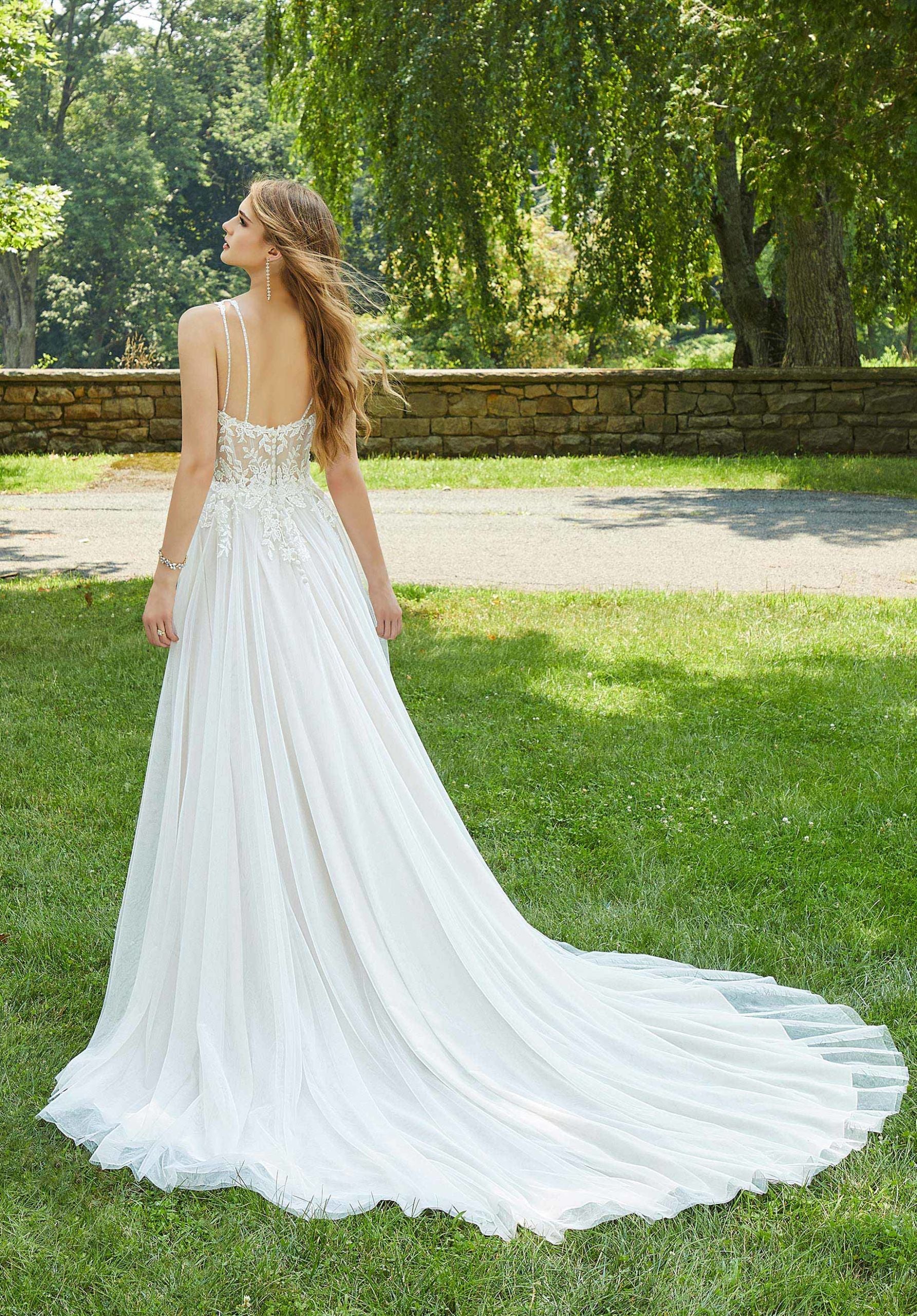 The UNK-Darla wedding dress, designed by Madeline Gardner for Voyagé, is an elegant floor-length gown. It features a flattering scoop neckline and delicate straps. Available in Ivory/Champagne/Honey and Ivory/Porcelain. This gown has a natural waist. Available sizes: 0, 00, 000, 2, 4, 6, 8, 10, 12, 14, 16, 18, 20, 22, 24.