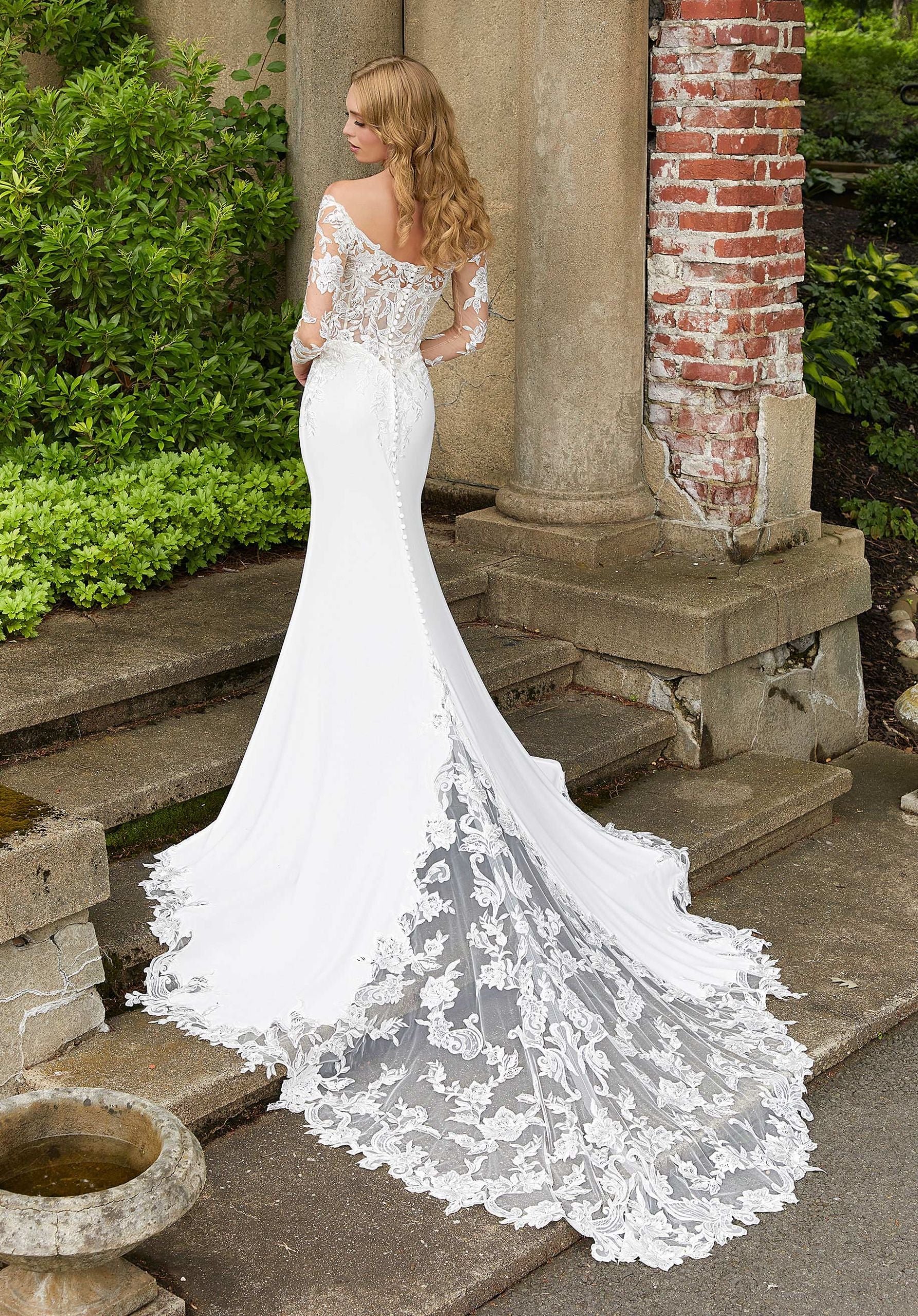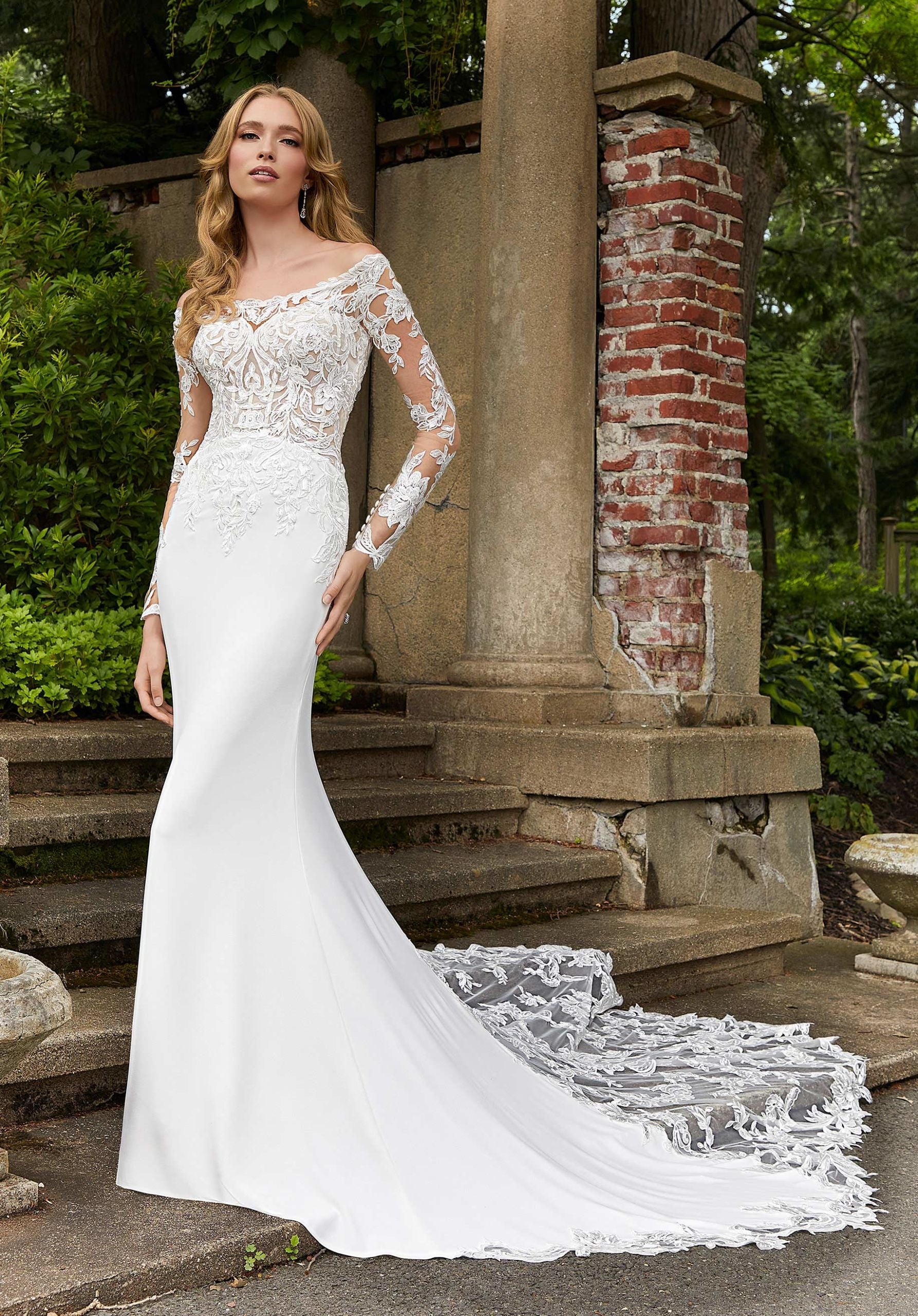 Cool crepe gets an upgrade in our Deanna wedding dress. The sleek fit and flare features an off-the-shoulder neckline and illusion long sleeves on a frosted, embroidered lace bodice creating unexpected beauty in the layering of fabrics and textures. To finish off the gown, we’ve added a stunning scalloped train with cut-away lace detail. Shown in Ivory/Honey.