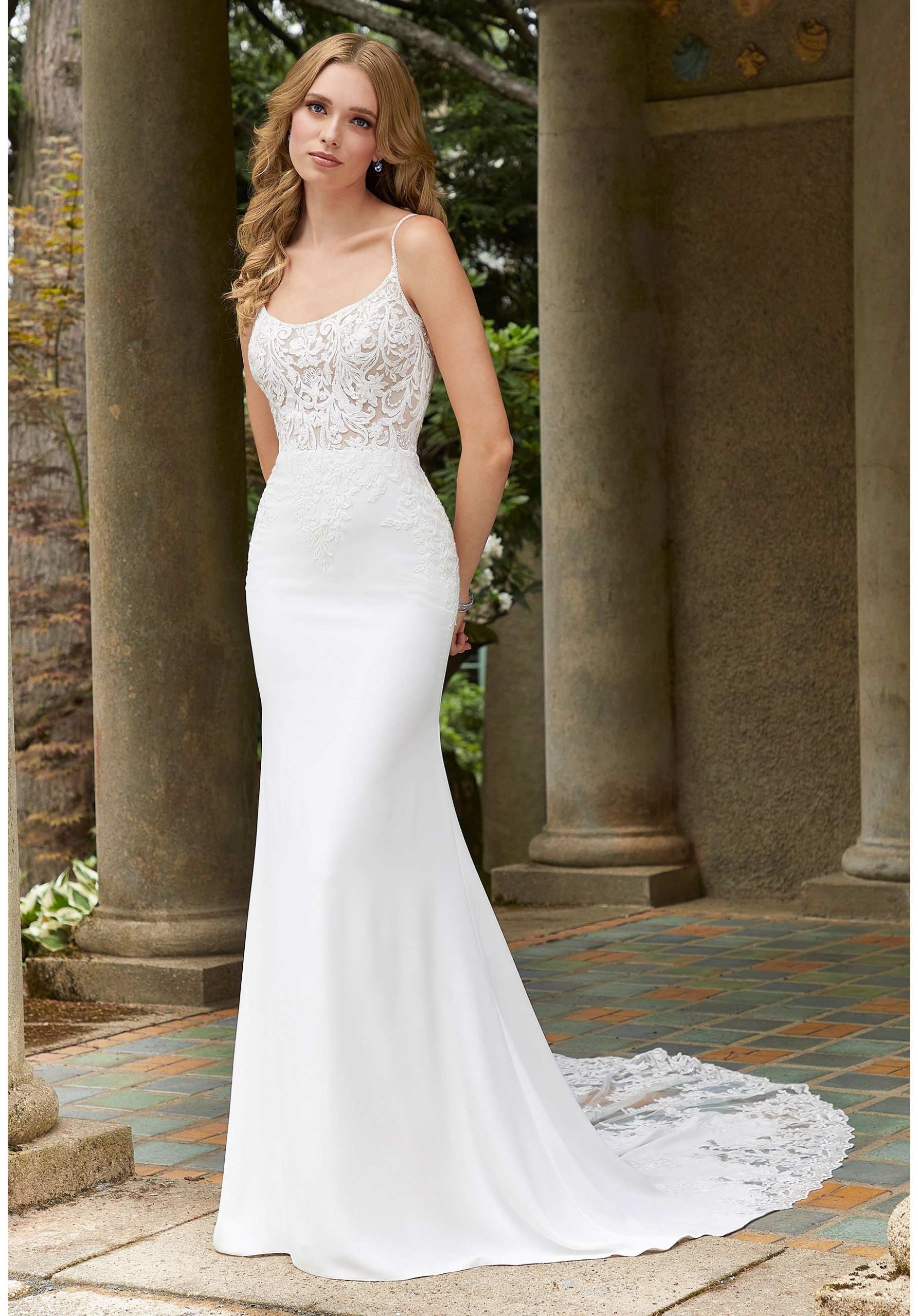 Sleek style and sophisticated glamour come together in our Diane wedding dress. The cool and contemporary fit and flare features a scoop neckline on a sheer bodice covered in intricate frosted, embroidered appliqués. The clean crepe skirt creates modern lines, but our favorite part is the breathtaking open back with sheer detailing finished off by a lovely cut-away train. Shown in Ivory/Honey. Reversible front bodice lining available as Style 5953LB.