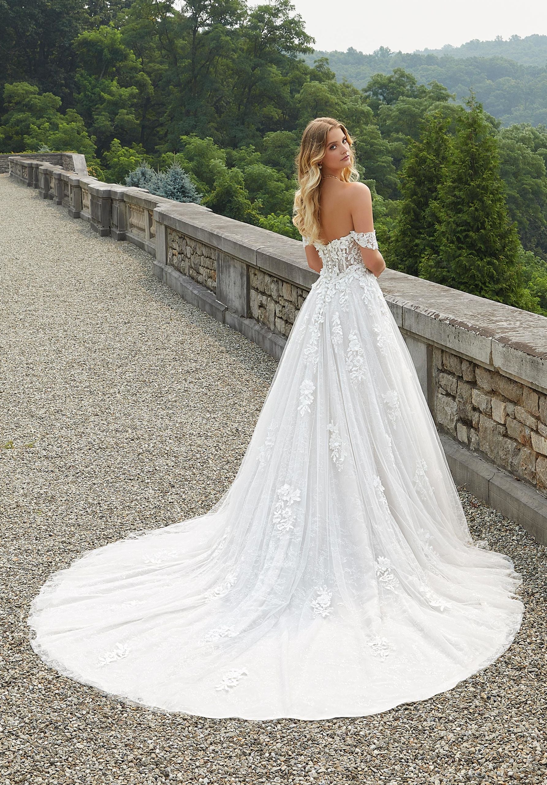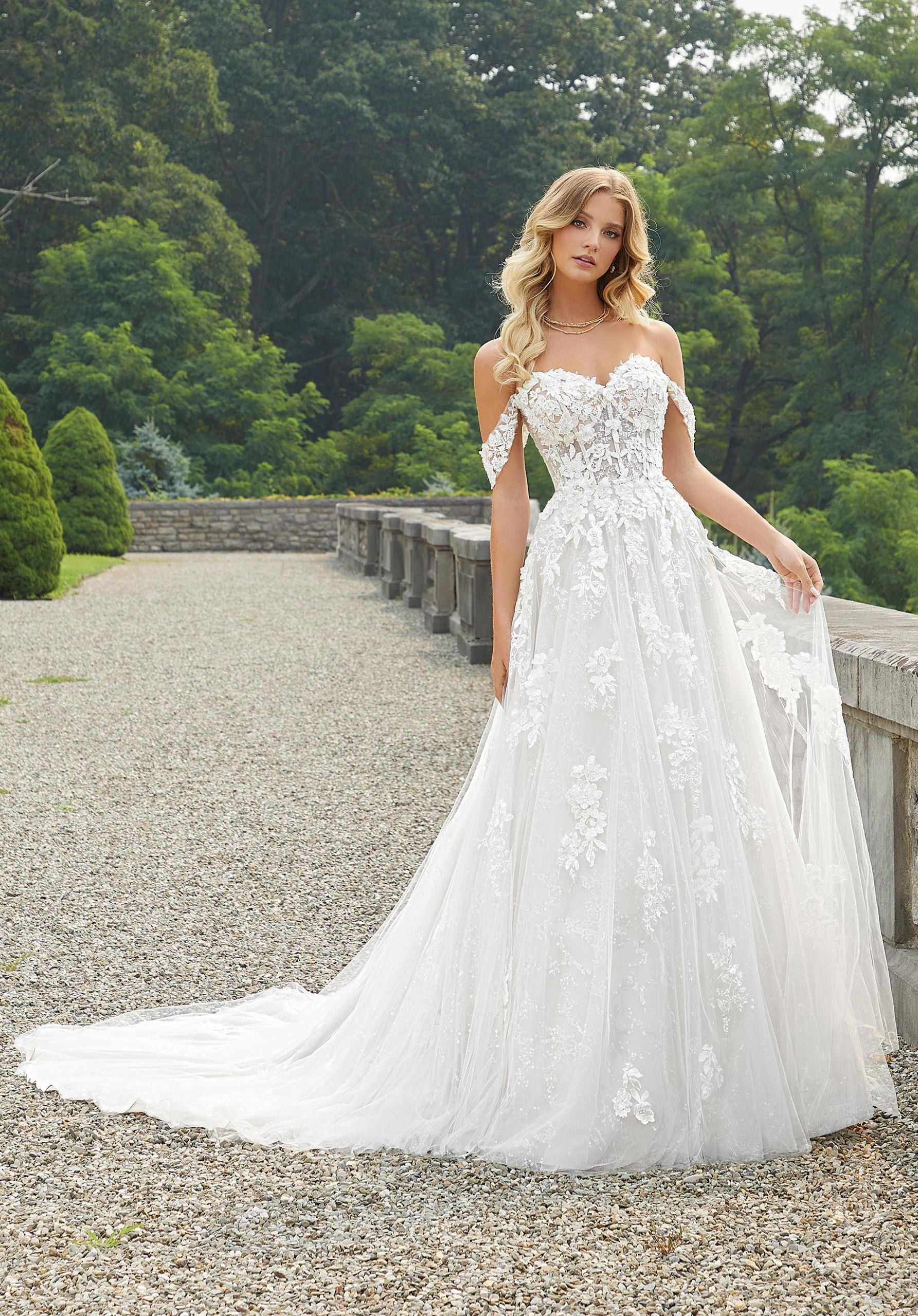 Designed with divine inspiration, our Divina designer wedding dress is a dream. The soft A-line ball gown features an expertly crafted bustier bodice with a strapless sweetheart neckline accented by crystal beaded, 3-D floral appliqués. Patterned sequin tulle gives the gown a dimensional sparkle, and with the detachable off-the-shoulder sleeves, it’s the definition of whimsical romance. Shown in Ivory/Almond/Honey.