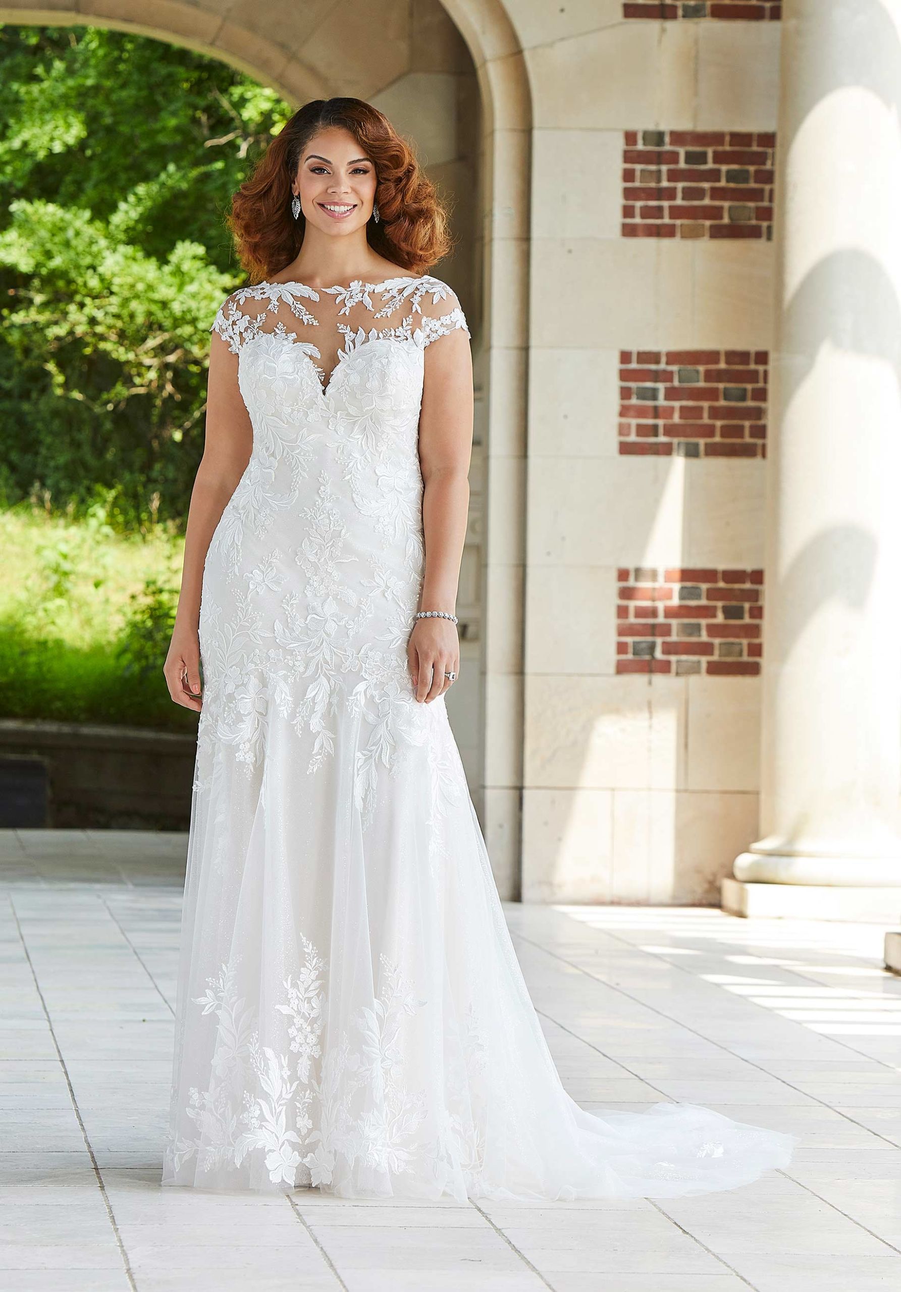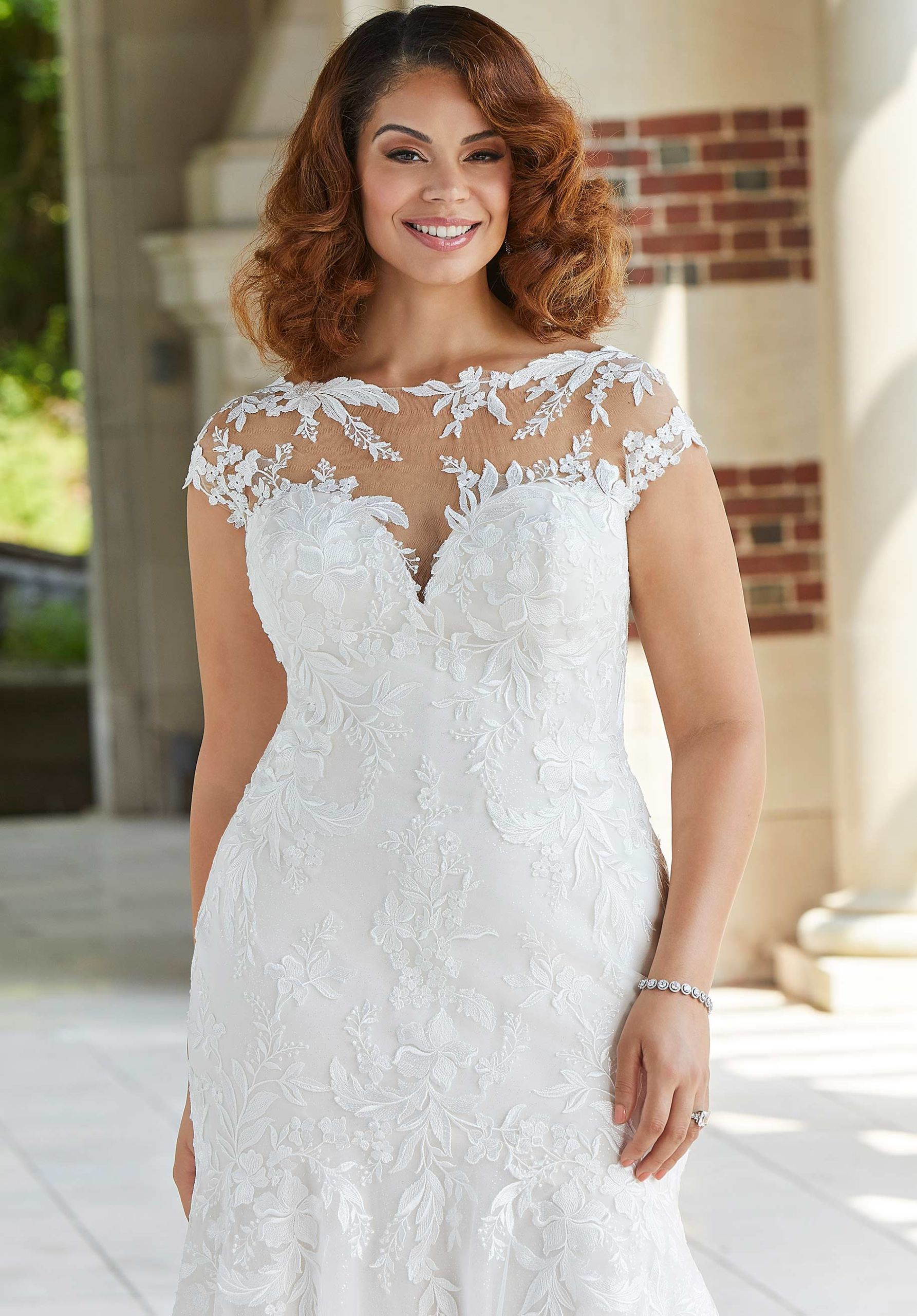 Ellery is a soft mermaid featuring a modest illusion neckline with cap sleeves and stunning embroidered lace appliqués. The sparkle net fabric offers dimensional shimmer, but it’s the back that takes our breath away. An open scoop back with illusion detailing is show stopping but paired with a sheer, chapel train this dress is an absolute vision. Shown in Ivory/Champagne/Honey. Available in three lengths: 55″, 58″, 61″.