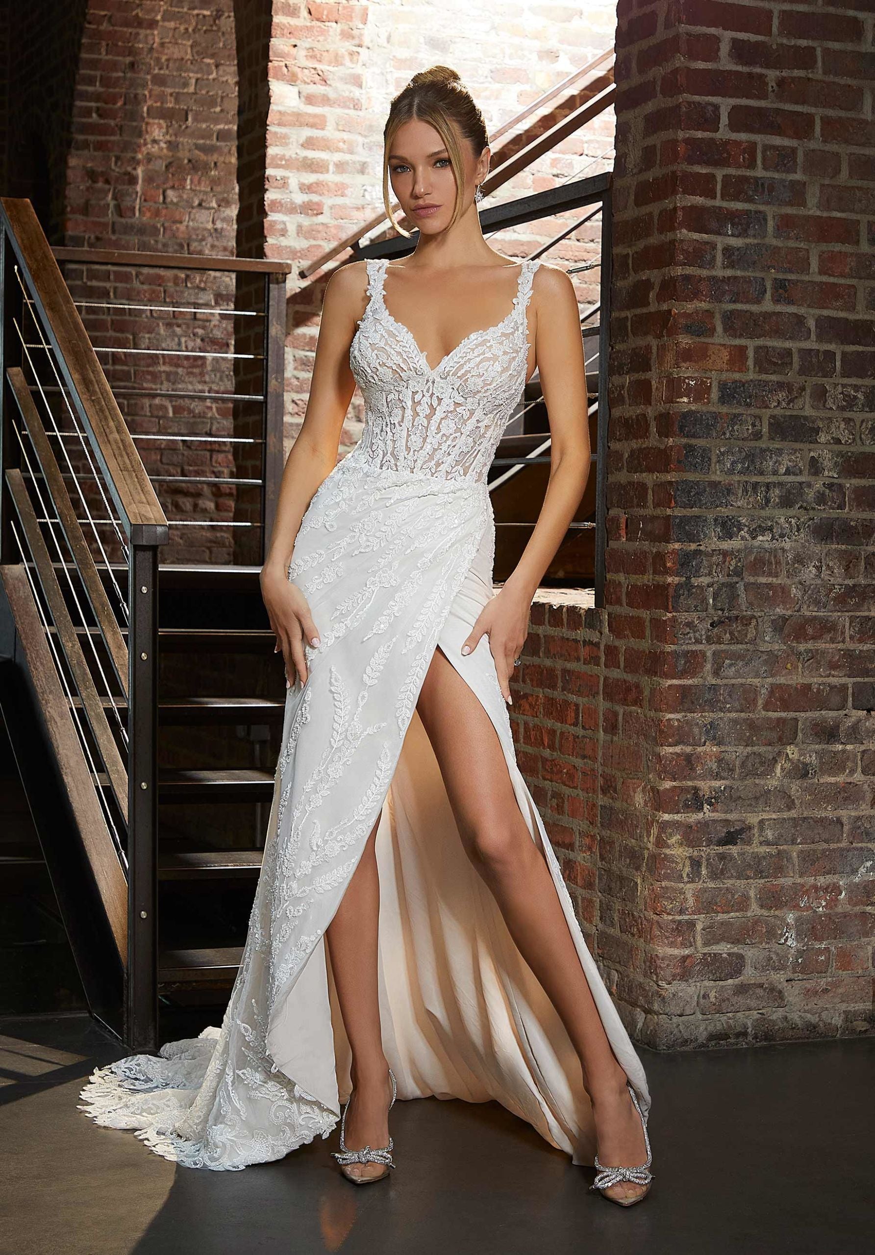 The UNK-Harper wedding dress from the Signature Collection, designed by Madeline Gardner, offers timeless elegance. Available in Ivory/Almond/Honey and Ivory/Porcelain. Sizes range from 000 to 24. This sheath silhouette gown features a floor-length net fabric, a natural waist, and delicate straps. The neckline is available in Sweetheart or V-neck. Price ranges from $2000-$6500 USD.