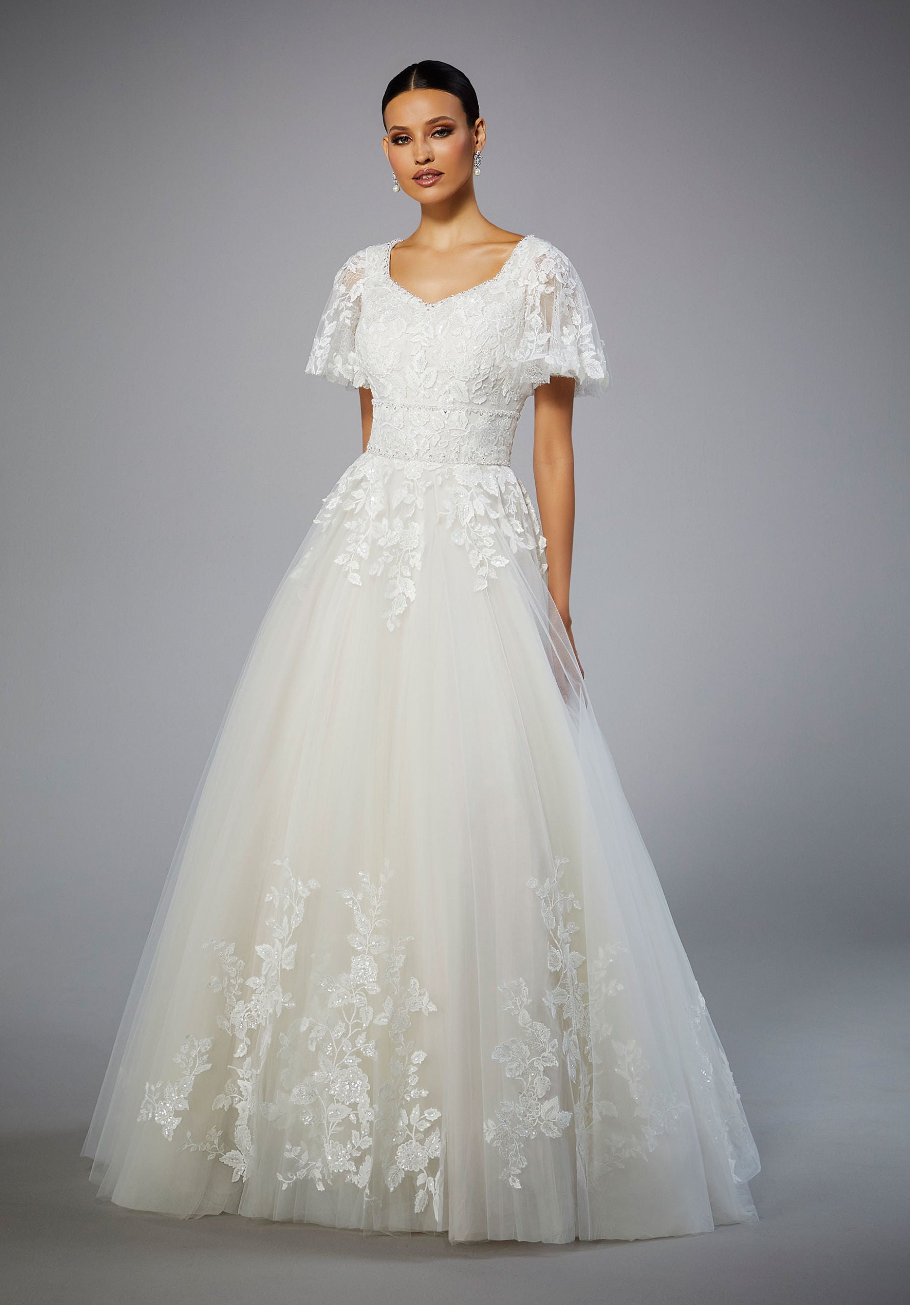 Fanciful and romantic with a boho twist, there’s so much to love about our Harriet designer wedding dress. The billowing A-line ball gown has a chic v-neckline, accented by blingy beaded and delicate frosted, embroidered lace appliqués on a Chantilly lace bodice. The flutter sleeves are a flirty touch, while the double-banded waist cinches you in, enhancing the cloud-like effect of the tulle skirt. Shown in Ivory/Almond.