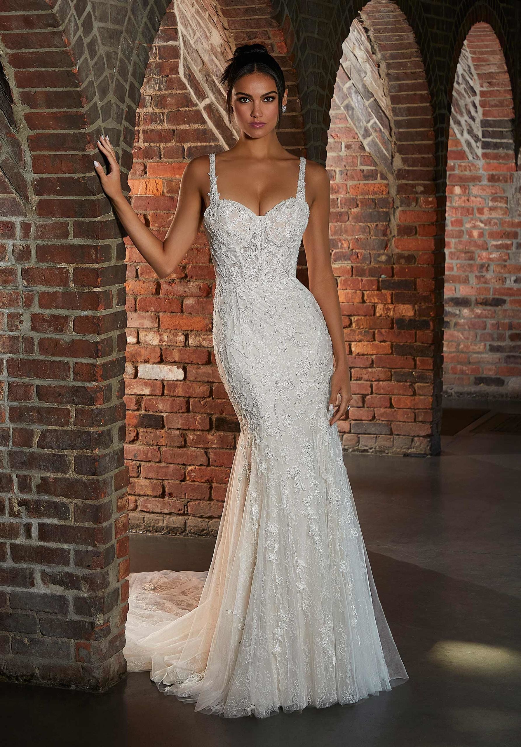 The UNK-Heloise wedding dress from the Signature Collection, designed by Madeline Gardner, is a fit and flare silhouette crafted from delicate lace. This floor-length gown features a sweetheart neckline, natural waist, and straps. Available in Ivory/Almond/Honey and Ivory/Porcelain color options. Sizes range from 000 to 24. Price ranges from $2000-$6500 USD.
