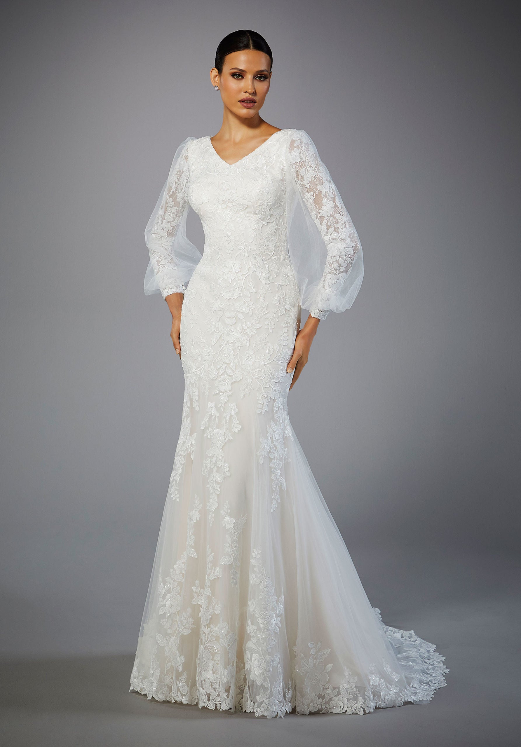 A graceful gown, our Hermione designer wedding dress is a timeless fit and flare with decadent details. The high v-neckline is both modest and classic leading to long lace sleeves with a unique sheer bishop sleeve overlay. The fitted gown features lovely frosted, embroidered lace appliqués on effortless tulle with a scalloped hemline and dreamy sheer train. Shown in Ivory/Champagne.
