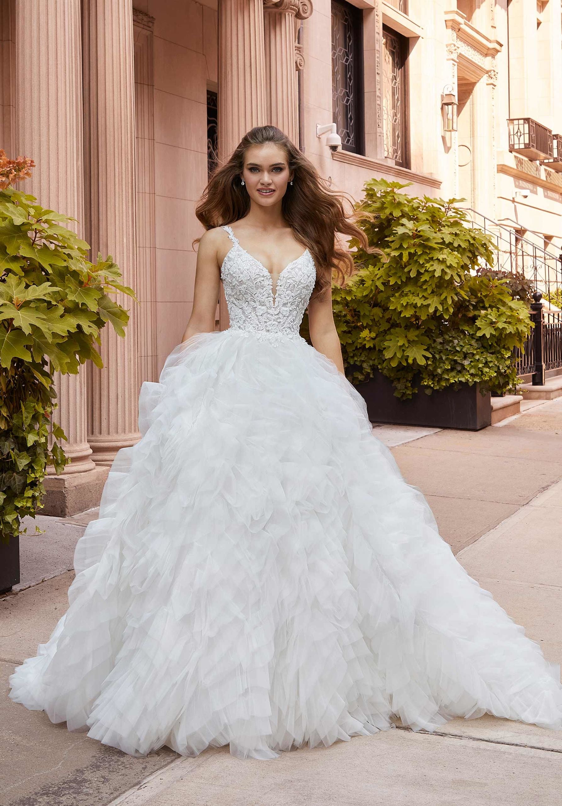 Our Juanita designer wedding dress serves dreamy drama. The gorgeous crystal beaded embroidered bodice, shimmering in glitter net, features a wide v-neckline and cheeky plunge. The ruffled tulle skirt creates a bridal moment that can’t be rivaled with fabulous texture and movement as you strut down the aisle. Shown in Ivory/Honey.