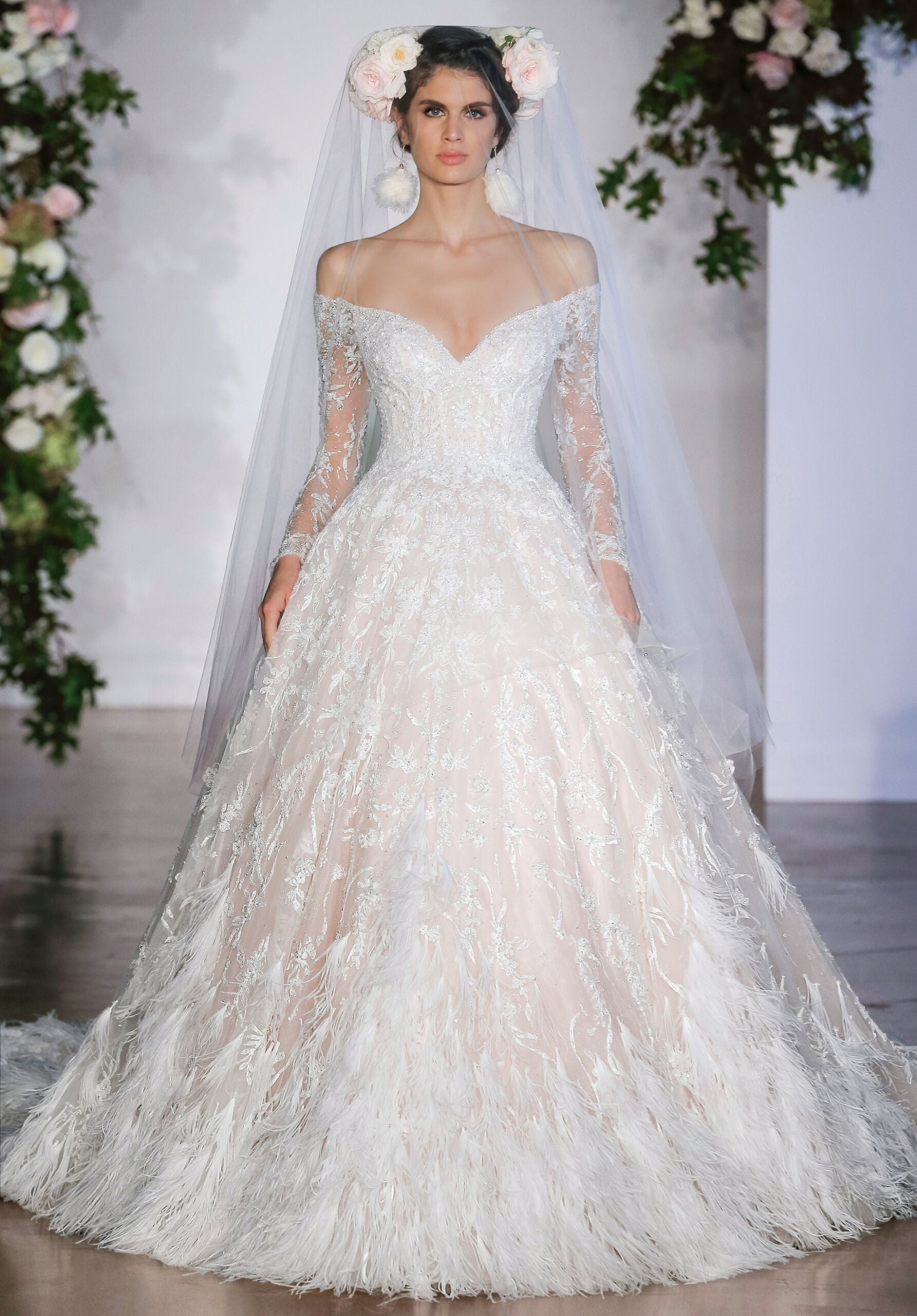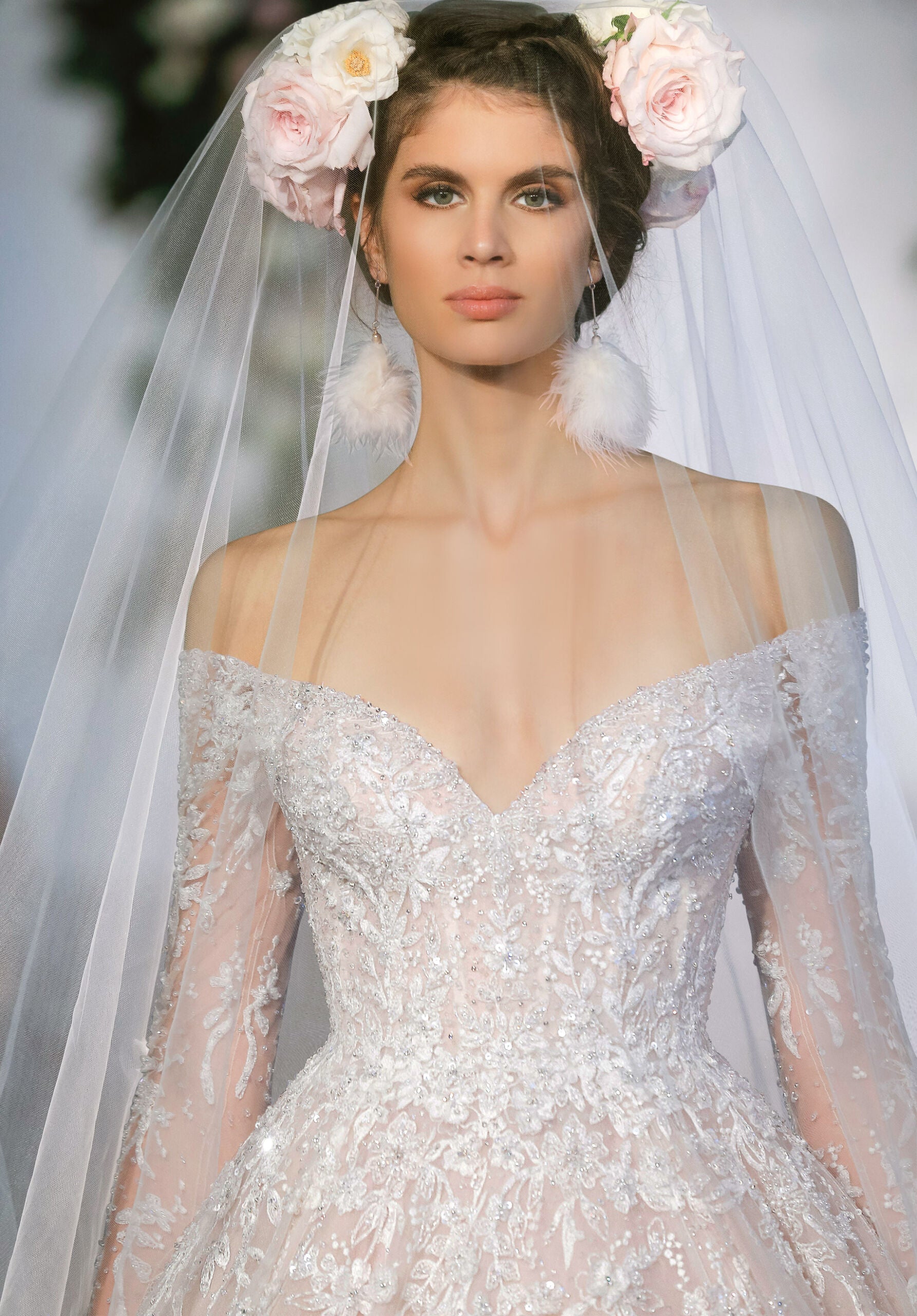 The UNK-Kristabelle wedding dress, from the Signature Collection by Madeline Gardner, is a stunning ball gown silhouette crafted from delicate tulle. It features a romantic off-the-shoulder neckline and elegant long sleeves, accentuating the natural waist. Available in Black/Nude, Ivory, and Ivory/Nude, and sizes 000 to 24. This long gown ranges in price from $2000 to $6500 USD.