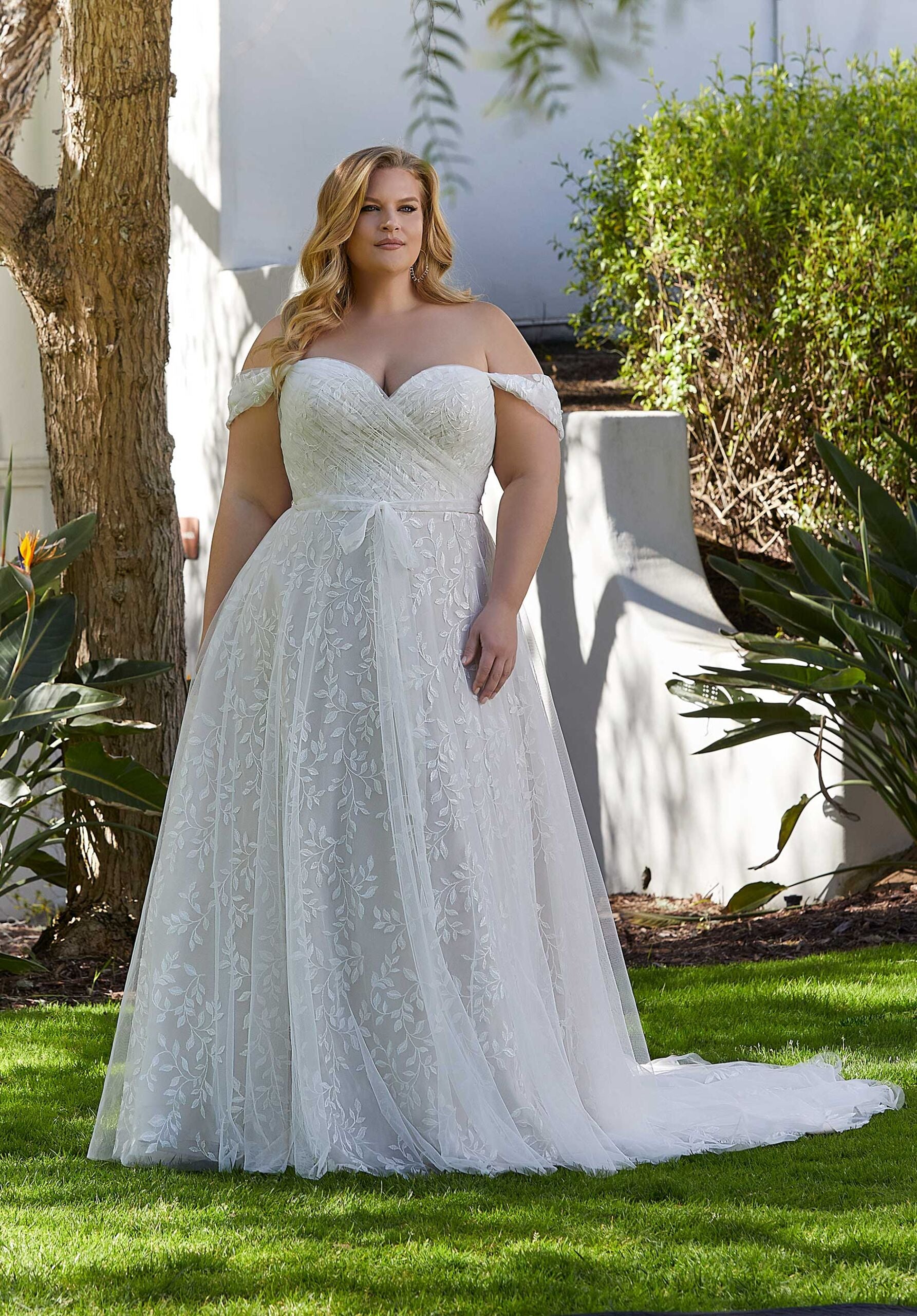 Vine-inspired allover embroidery gives our Laurentina designer wedding dress a natural feel. The sweetheart bodice features delicately draped tulle with a dainty tied sash at the waist to define your figure. A gossamer tulle overlay floats down the A-line ball gown, while detachable off-the-shoulder sleeves have a dreamy effect. Shown in Ivory/Champagne.