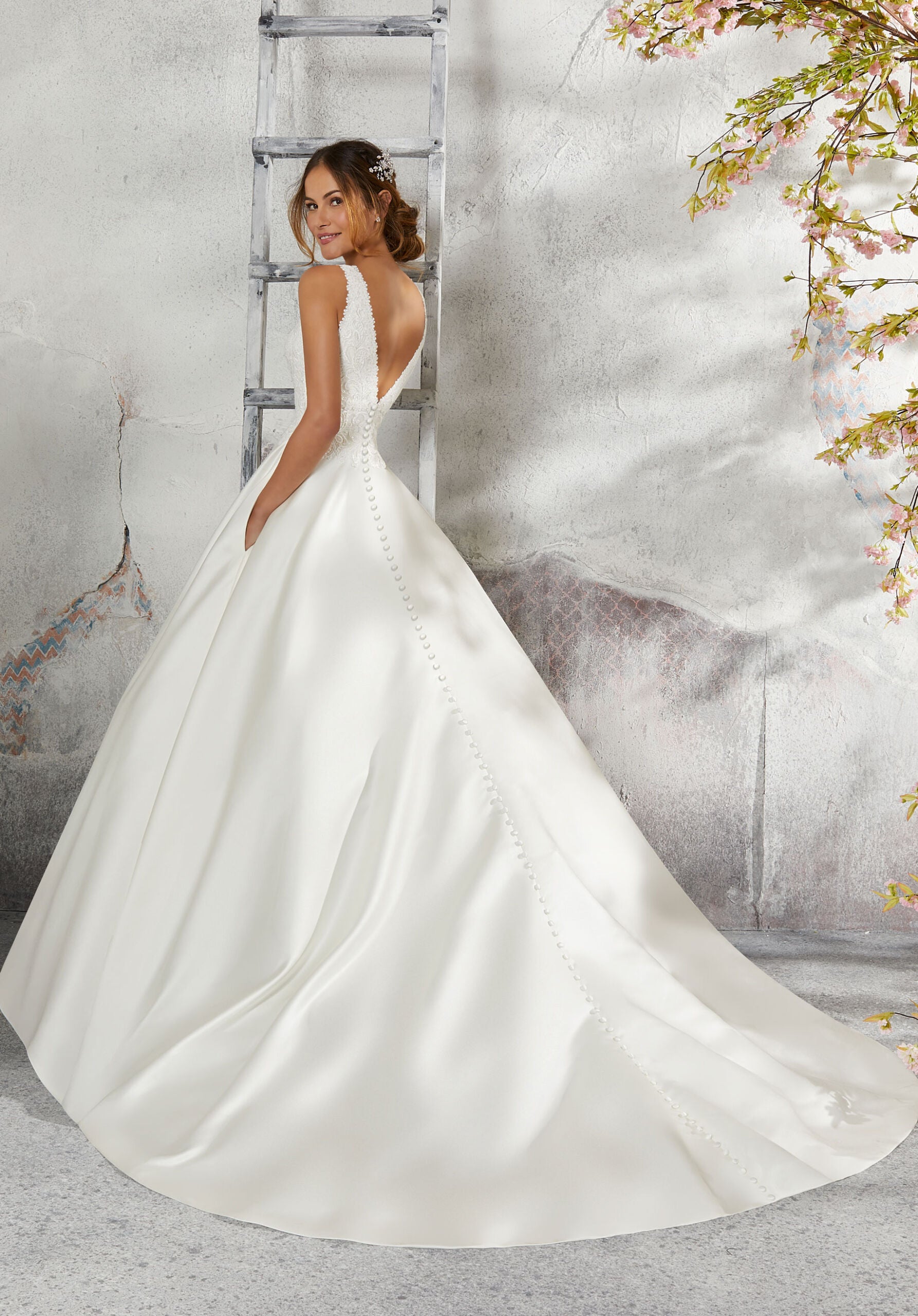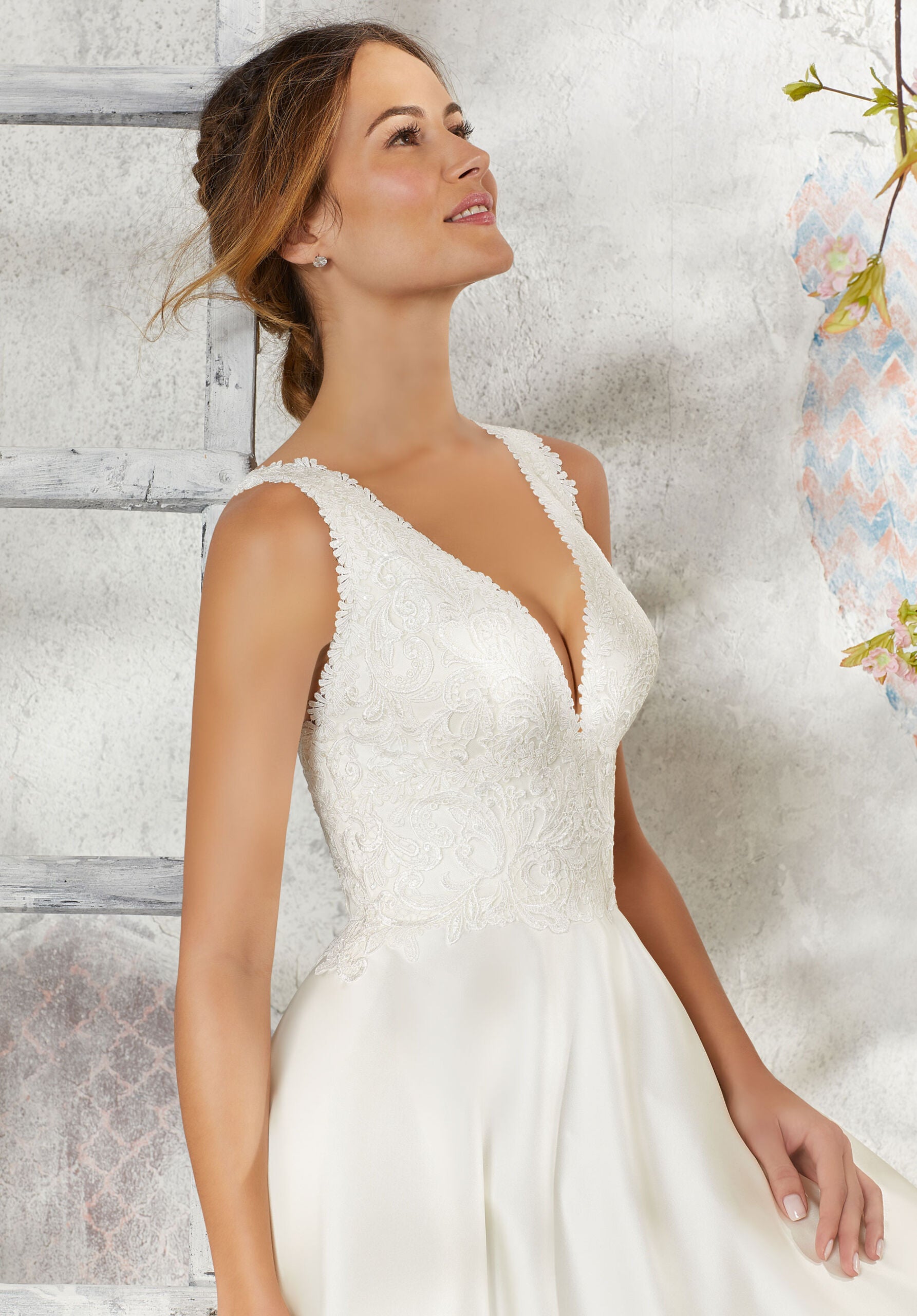 This elegant sleeveless Laurie designer bridal gown features beautiful appliqués, lace, and beading on an intricately designed satin wedding dress. Available in white and ivory, the v-neck neckline completes the ball gown silhouette of this designer bridal gown.