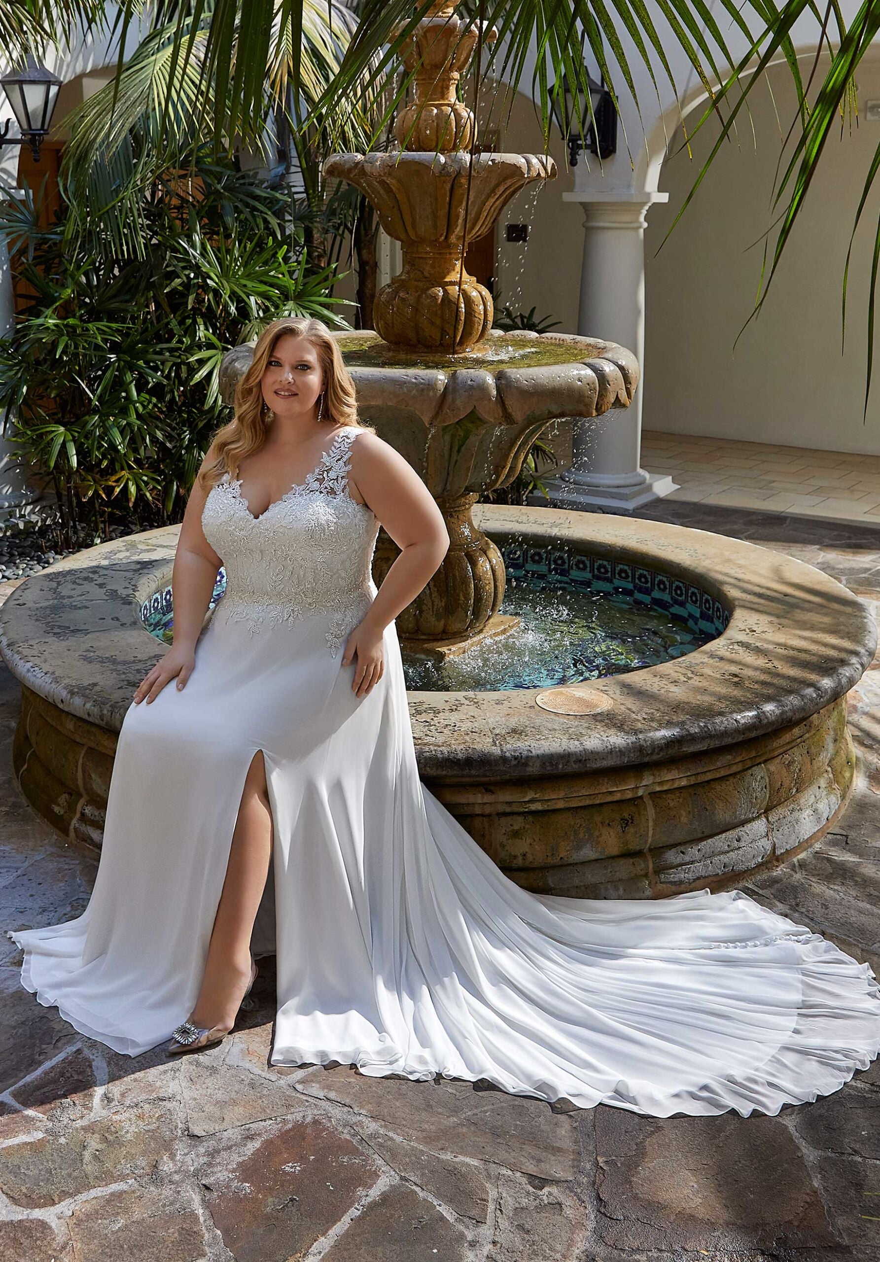 Our Lianne designer wedding dress is an understated A-line featuring lovely crystal beaded, embroidered appliqués on a Chantilly lace bodice with a v-neckline and supportive, sheer straps. The chiffon skirt has an effortless feel, with a front skirt slit for added movement and a pop of leg. Shown in Ivory/Honey.
