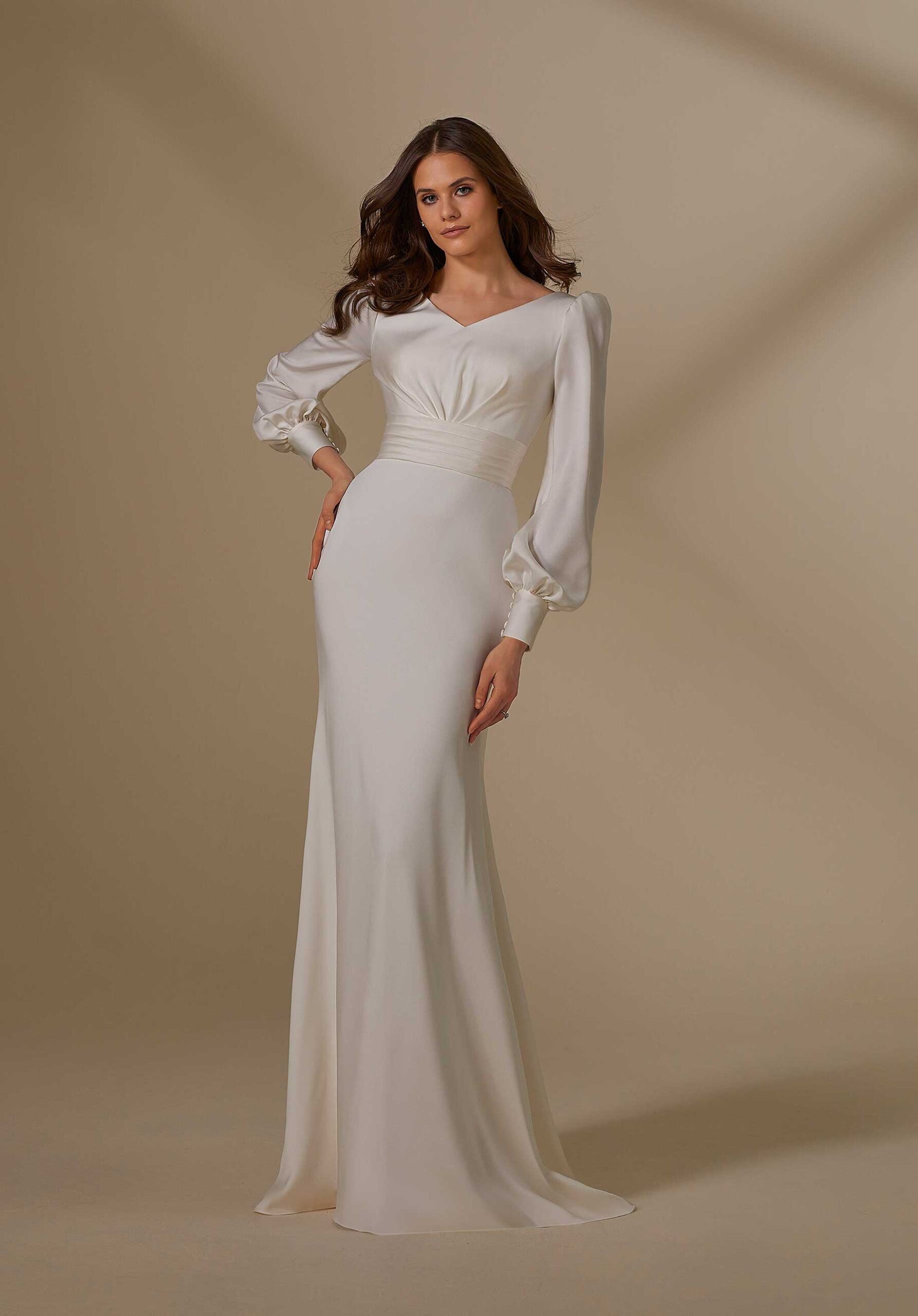 Simply classic, our London designer wedding dress is a silky crepe fit and flare that is effortlessly chic. The gown features a high v-neckline and vintage-inspired bishop sleeves. Tie-back streamers cinch you in, defining your figure, and create a playfully dainty bow. Buttons down to the hem are a timeless touch that completes the look. Shown in Ivory.