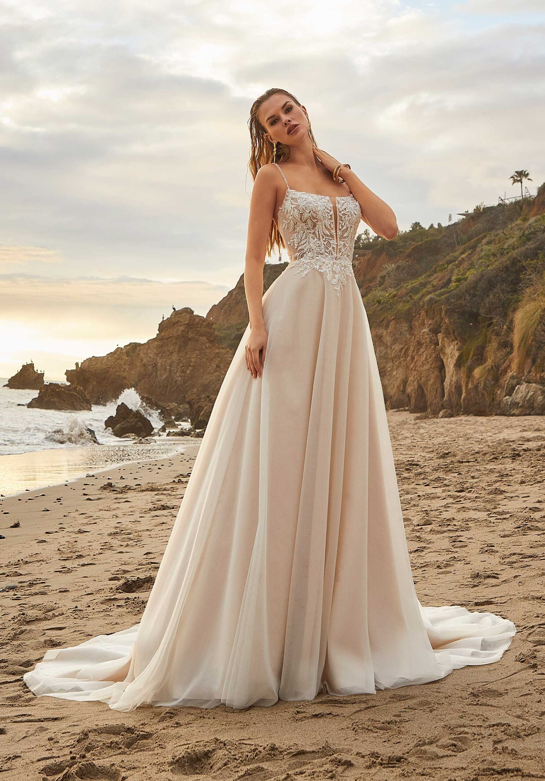 Our Marcia designer wedding dress has an understated sexiness that brides will love. The billowing A-line floats off the body in lightweight tulle with a sheer, scoop neck bodice featuring a sultry plunge. The angled boning helps define your figure and gorgeous crystal beaded lace appliqués give the gown a glamorous effect. Add on the detachable beaded straps for an extra pop of sparkle. Shown in Ivory/Latte/Honey.