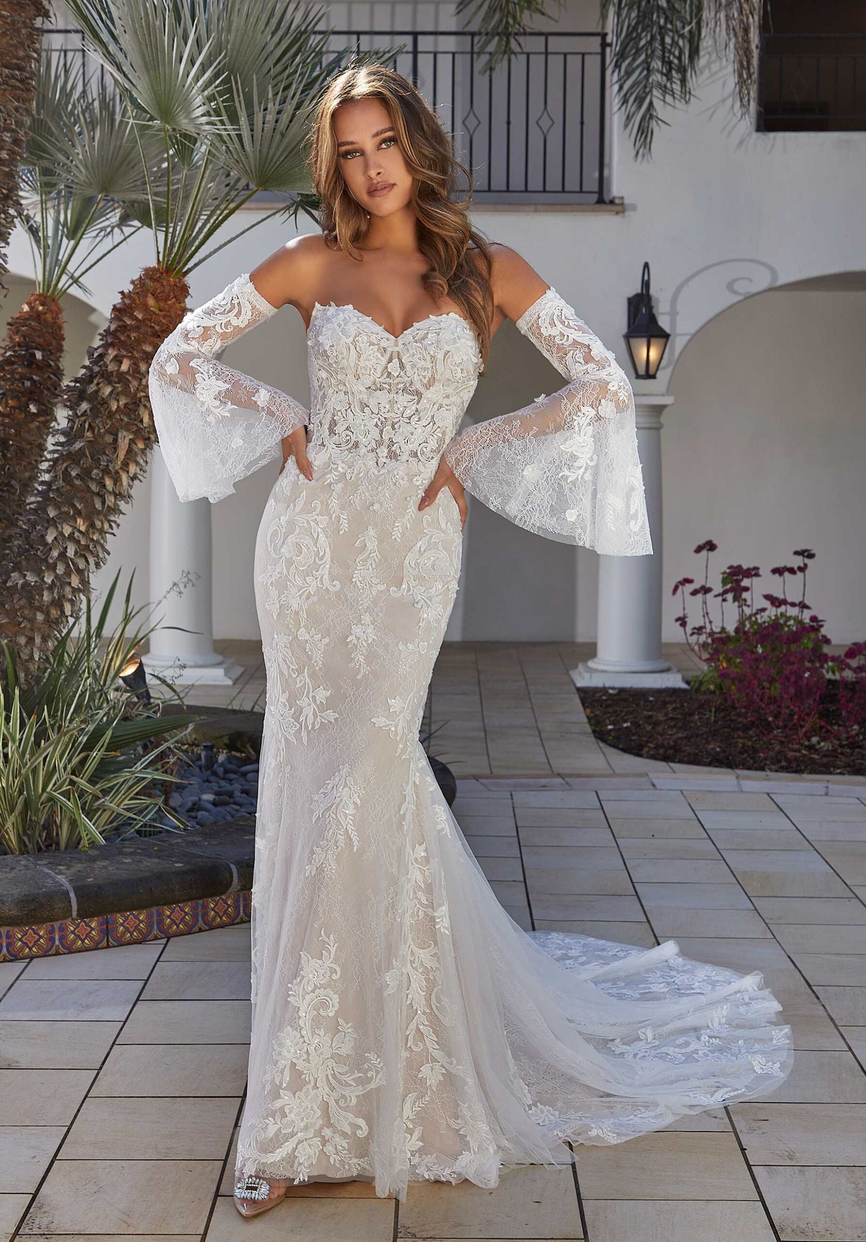 The UNK-Marie wedding dress, designed by Madeline Gardner for Morilee, offers a stunning fit and flare silhouette in lace and tulle. Available in Ivory/Champagne/Honey and Ivory/Ivory, this floor-length gown features a strapless, sweetheart neckline and a natural waist. Sizes range from 000 to 24. The dress includes detachable bell sleeves and spaghetti straps. Price ranges from $1500-$2700 USD.