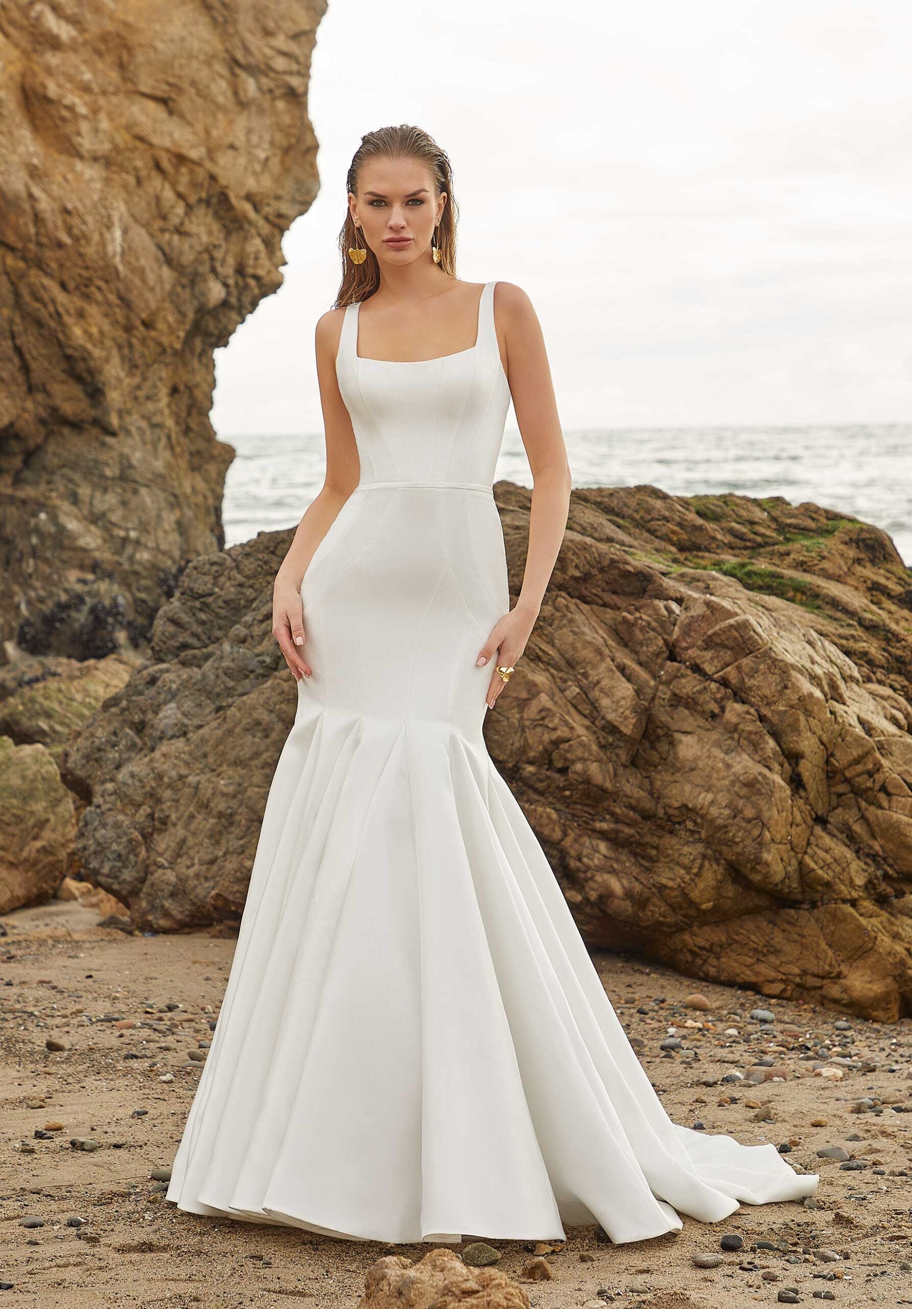 Our Marilyn designer wedding dress is all about body. The curve-hugging mermaid features contoured seaming to give you a shapely figure and add dimension to the luxe Diamantina satin. The square neckline is structured and simplistic, enhancing the clean lines of the chic gown. Shown in Ivory.