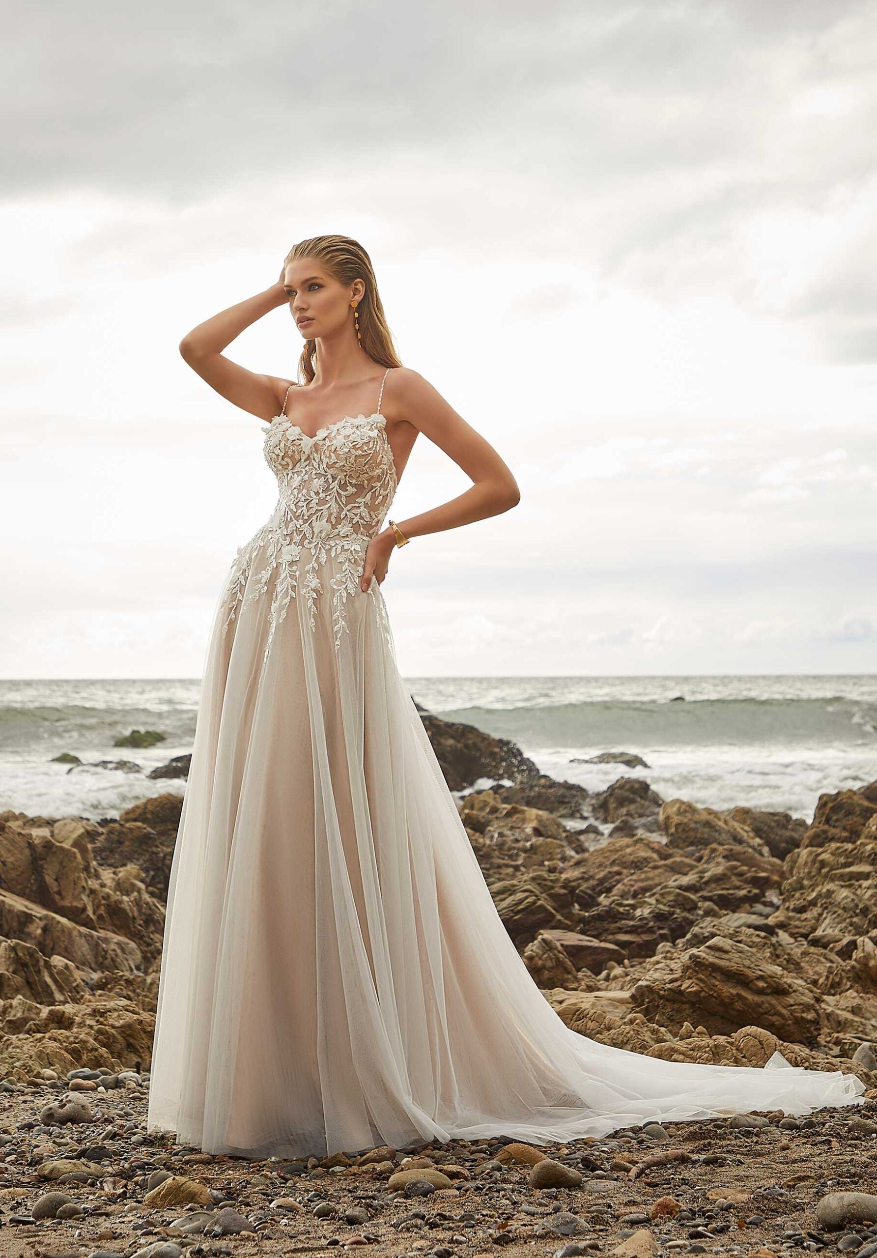 Our Melinda designer wedding dress is effortlessly elegant with a flowing A-line silhouette in airy tulle. The sheer, boned bodice features crystal beaded botanical lace with pops of three-dimensional floral lace appliqués, while the basque waistline helps to emphasize the look of a narrow waist. Shown in Ivory/Champagne.