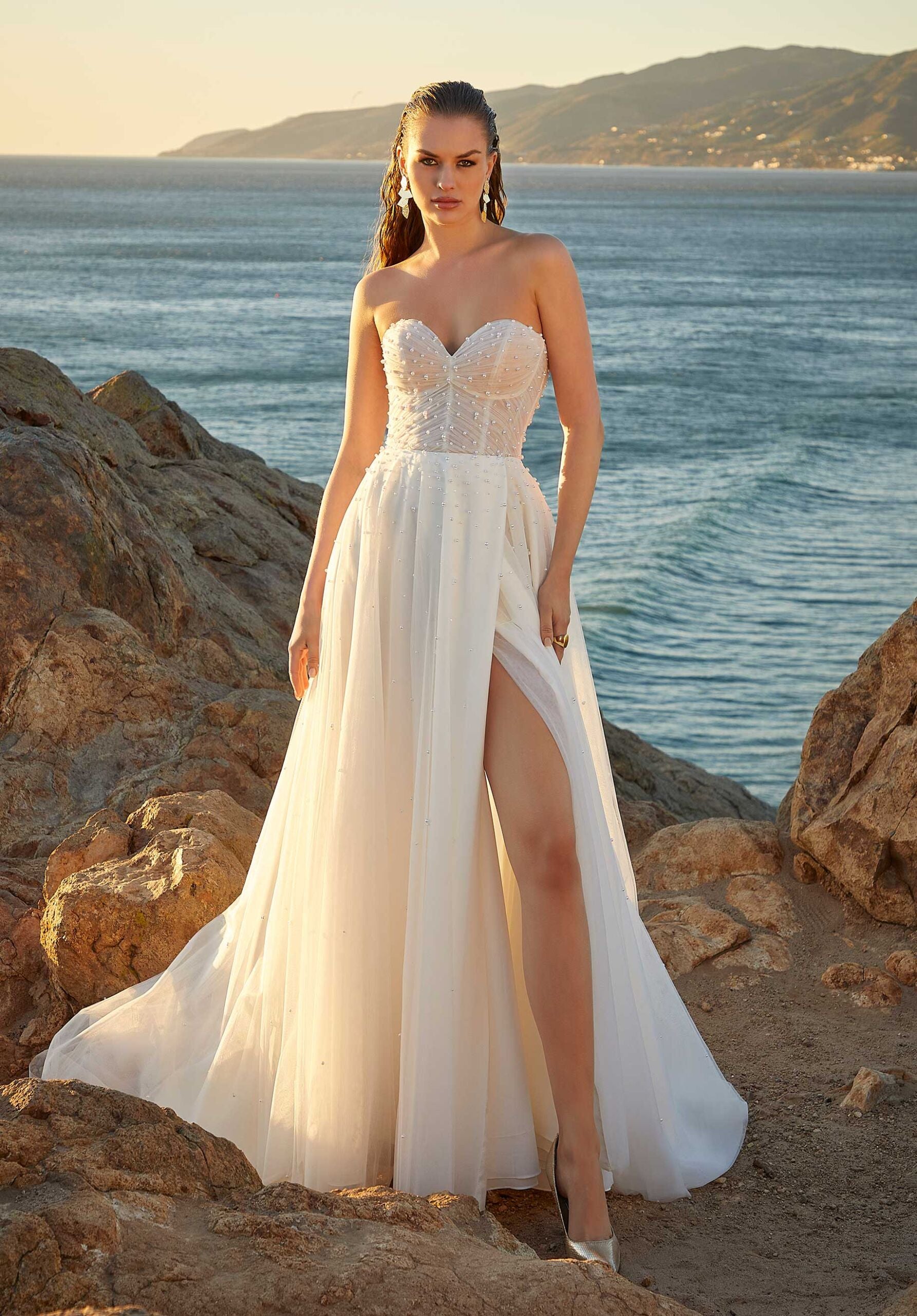 Romantic and adventurous, our Melissa designer wedding dress is a flowing tulle A-line designed with gleaming pearls. The sheer, bustier bodice features a strapless neckline and delicate draping, giving the dress texture and dimension. The skirt is effortless, with a front slit for added movement, and delicate pearl buttons leading to the hemline. Wear the gown with the matching tie-front capelet for unique touch. Shown in Ivory/Honey. Capelet also sold separately as Style 11481.