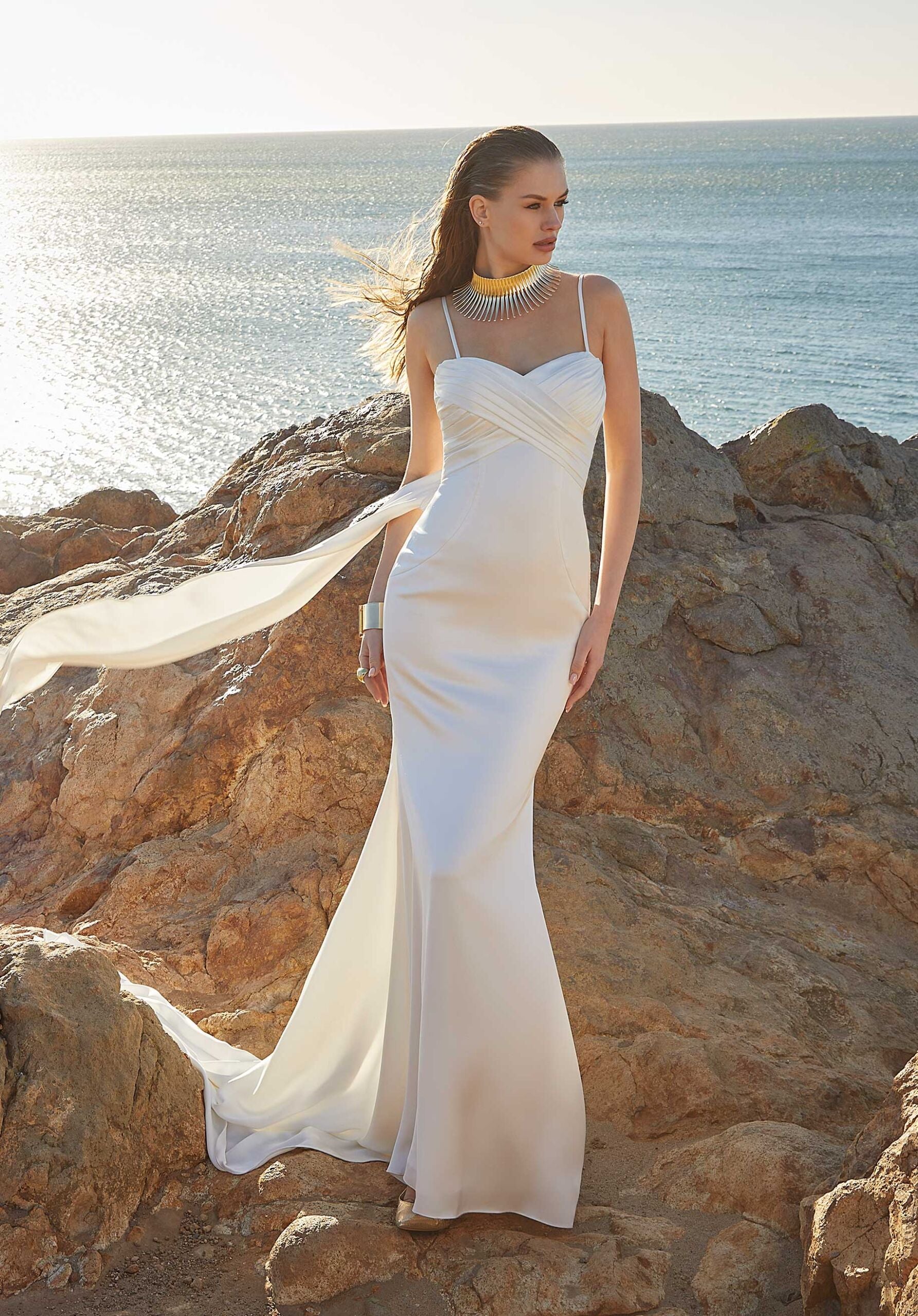 Luxe crepe back satin stuns on our Mindy designer wedding dress. The gown has a sweetheart neckline and empire waist with a draped, crisscrossing bodice that meets in the back to create tied streamers. The soft fit and flare silhouette features side seams that emphasize your curves. Shown in Ivory.