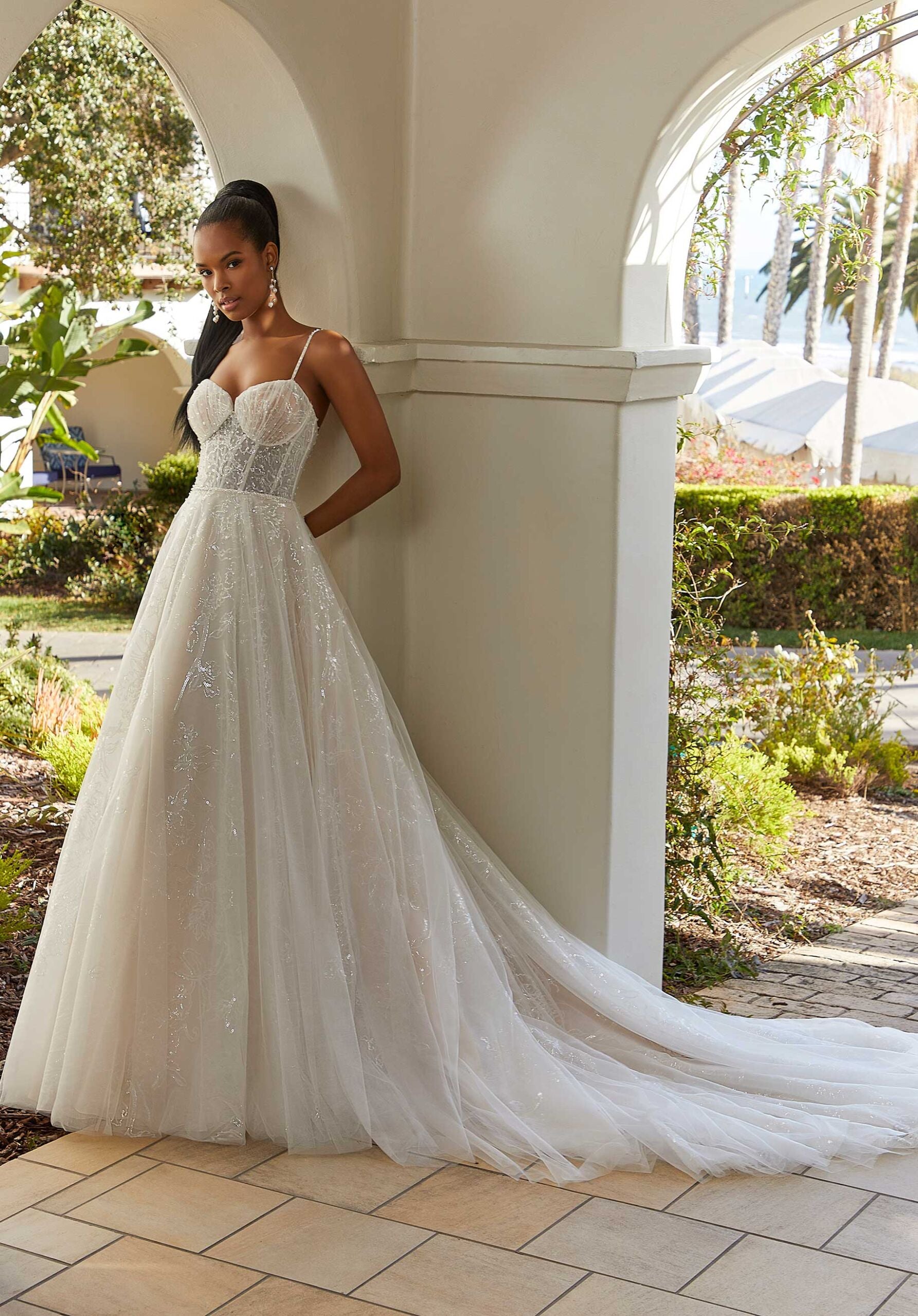The UNK-Mirella wedding dress, by Morilee designer Madeline Gardner, is an A-line silhouette gown crafted from delicate tulle. This floor-length dress features a straight neckline and spaghetti straps, accentuating a natural waist. Available in Ivory/Champagne/Honey and Ivory/Ivory. Sizes range from 000 to 24. Price varies between $1500-$2700 USD.