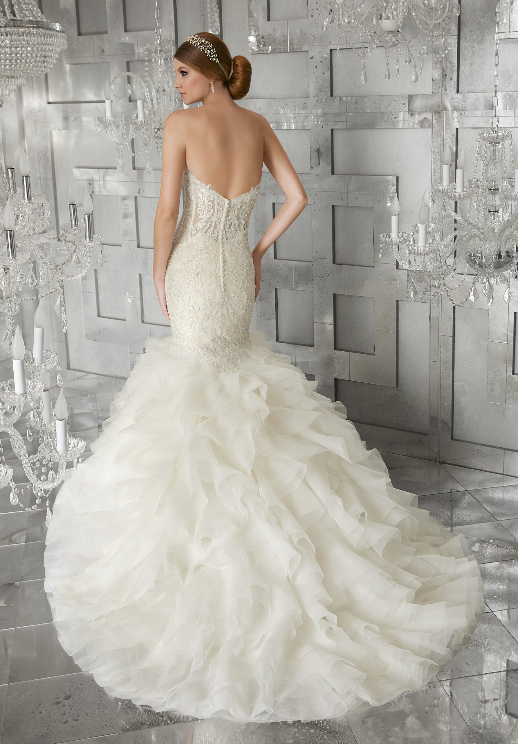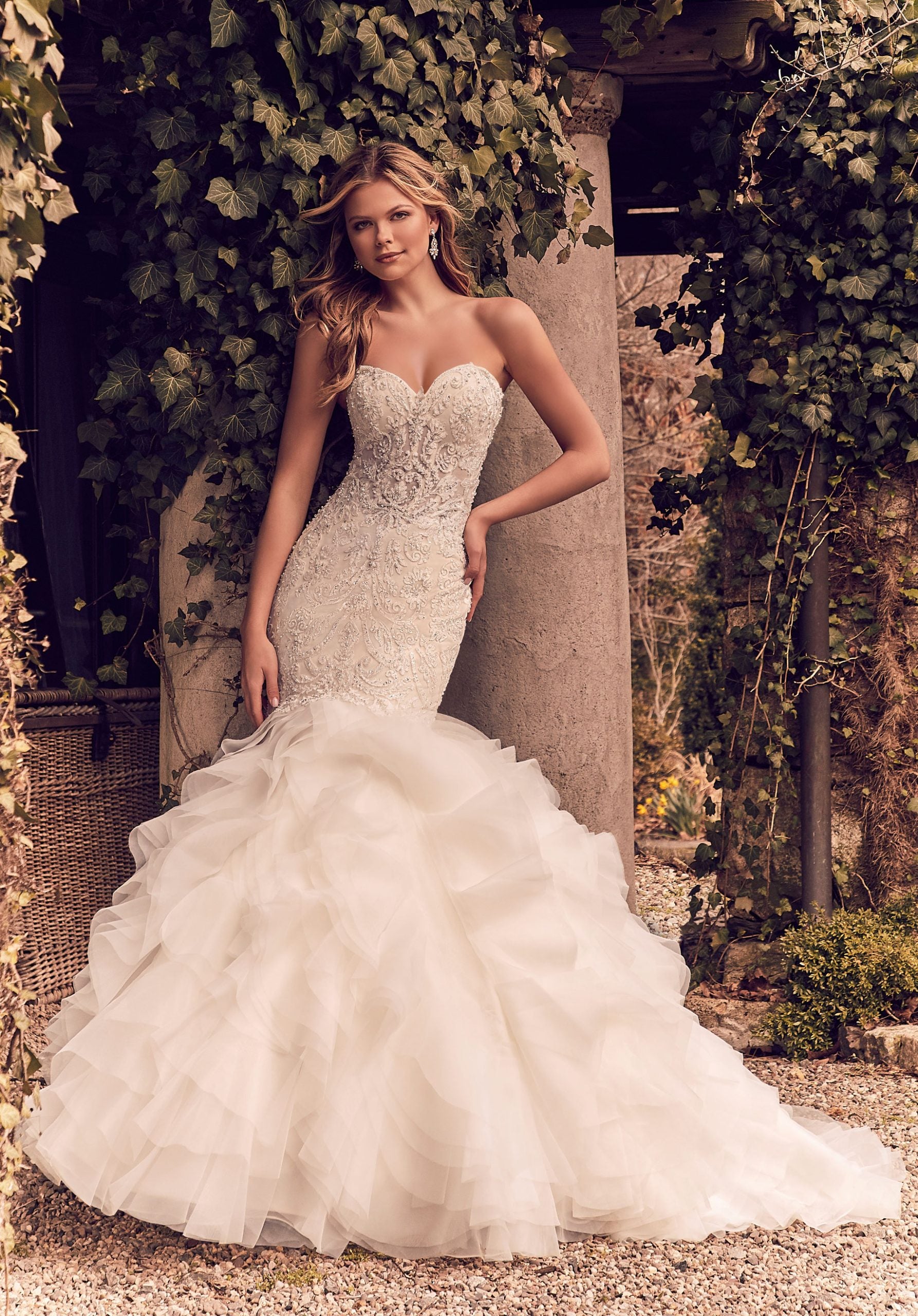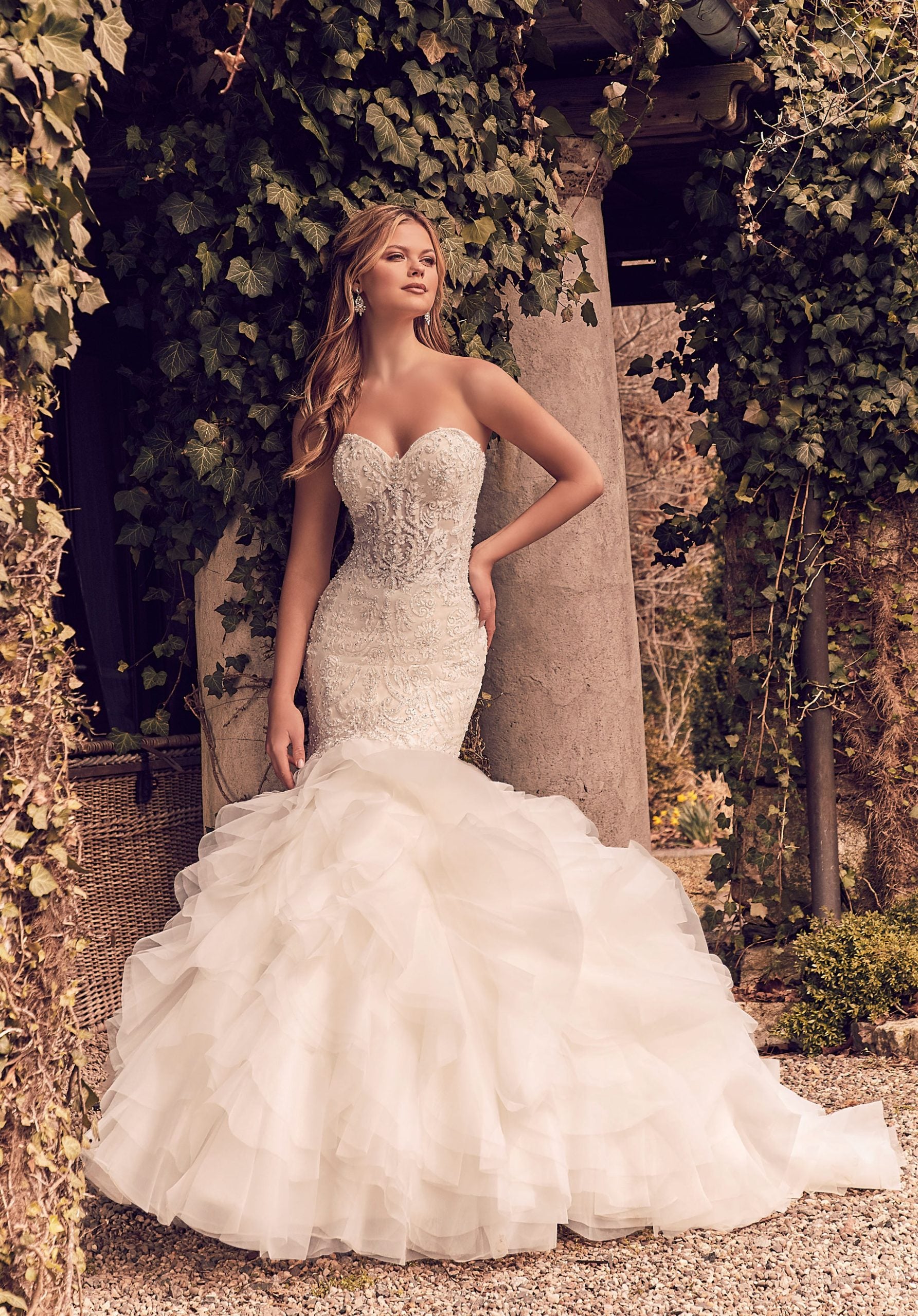 This strapless Muse designer wedding dress is accented by a romantic sweetheart neckline. This wedding dress features sculptured, embroidered appliquès with crystal beading on hand-cut, cascading organza. Available in white, ivory, and champagne, this bridal gown is highlighted by a mermaid silhouette. This wedding dress is available in three Lengths: 55”, 58”, 61”. The matching satin bodice lining is included. Shown with headpiece style HP2021. Shown in ivory/champagne.
